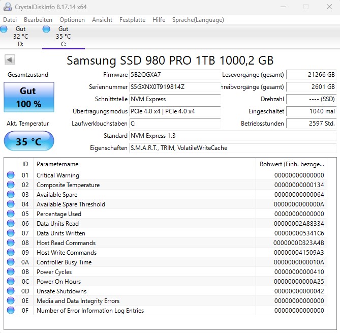 - m.2 980 pro (1. Slot m.2 Slot PCIe 4.0 4x)