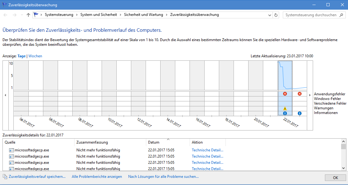 Ich habe es mit Windows 10 nochmal probiert. Im Zuverlässigkeitsverlauf sieht es bei Windows 10 so aus: