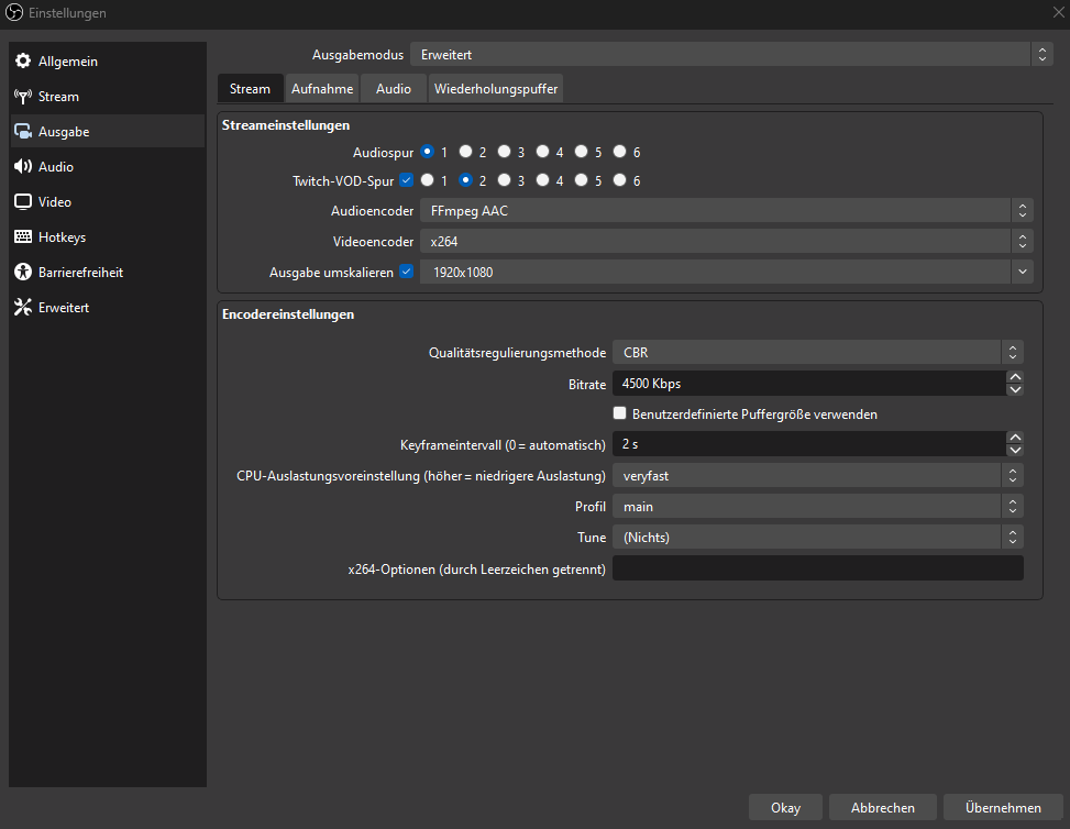 die 1600x900 kann man machen, jedoch sind die 900p keine sinnvolle Streaming-Auflösung. dann eher 1280x720 mit den 4500, oder 1664x936 mit 5000 kbps