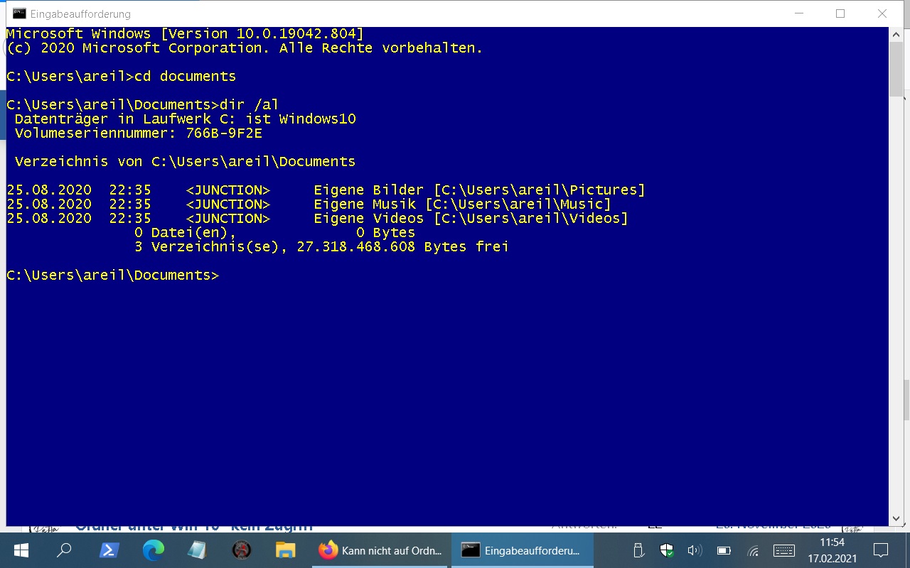 Ist es denn nicht möglich, in der linken unteren Ecke den Verknüpfungspfeil zu identifizieren? Das sind Weiterleitungen auf die entsprechenden Ordner in Deinem eigenen Benutzerprofil, die aus Kompatibilitätsgründen angelegt und nur vom System genutzt werden. Der Benutzer hat daran einfach keine Berechtigungen und er benötigt diese auch nicht, weil die nur für einen internen Mechanismus gebraucht werden, damit auch hundert Jahre alte XP Software nicht an den mit Windows Vista eingeführten Strukturen für die Benutzerprofile scheitern.wus schrieb:Was ist eigentlich der Sinn der Unterordner "Eigene Bilder", "Eigene Musik" und "Eigene Videos" im Ordner Dokumente wenn ich da gar nicht darauf zugreifen kann?