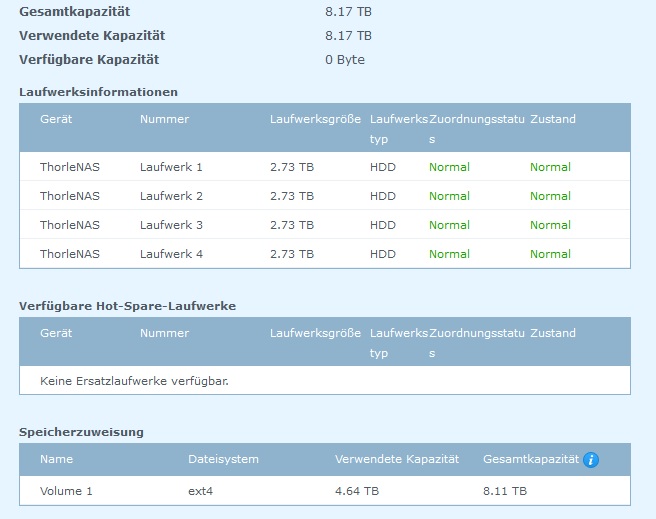 auf meiner Synology habe ich per Raid 5 mit 4 FP á 3TB insgesamt 8,17TB. Frei sind davon noch rd. 3,5TB.