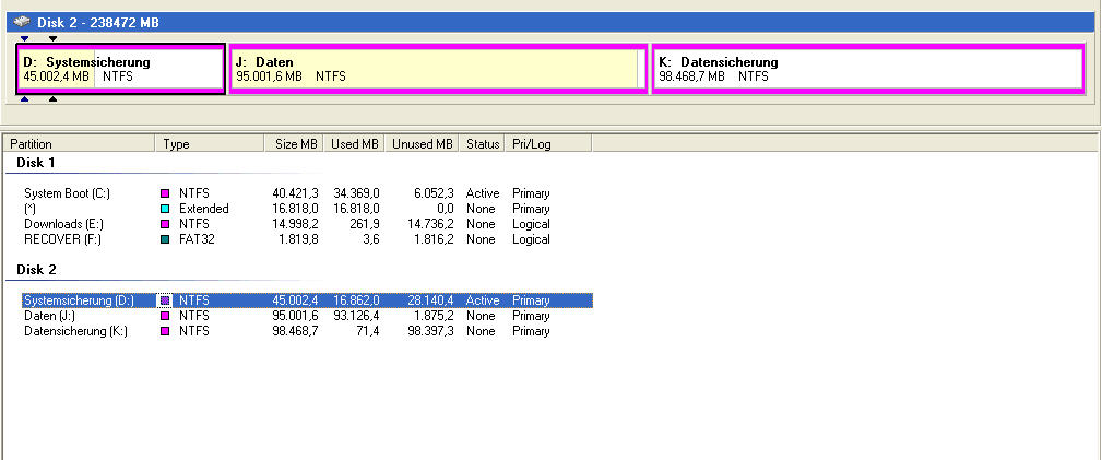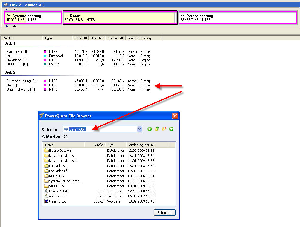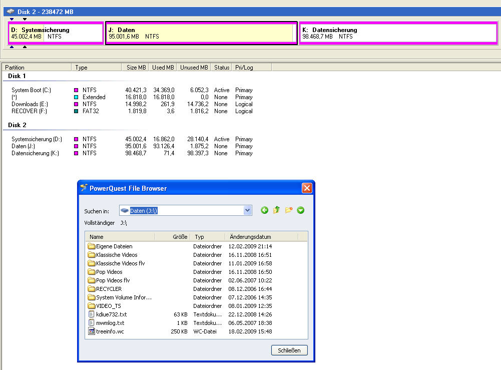 /shot 1) ; so sieht es aus mit Partition magic (Shot 2). Hier sehe ich meine Daten (Shot 3 + Shot 4).