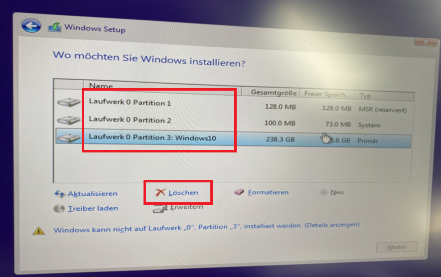Alle drei Partition löschen und dann eine neue Partition erstellen,und dann kannst du Windows 10 wieder neu installieren.FreeZy. schrieb:Ich kann nirgendwo mein Windows installieren bitte um Hilfe