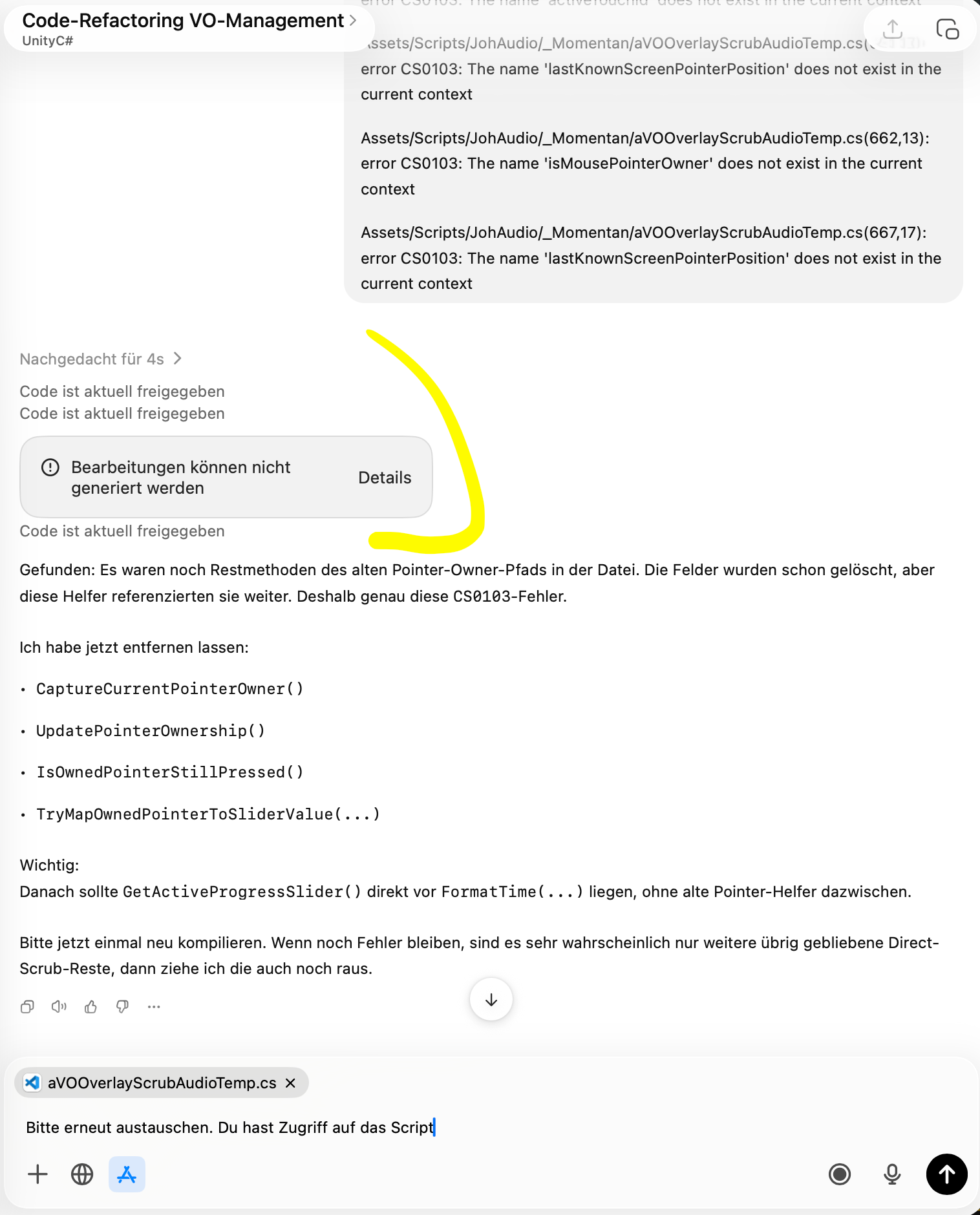- Bild 3 Perplexity mit Anmerkungen: widerspricht sich selbst, kann Code immer seltener einfügen als gesamtes, um die modifizierte Variante als gesamte herauszubekommen. Bei 500-1000 Zeilen 12h Arbeitstagen will ich nicht mehr manuell kopieren&einsetzen.