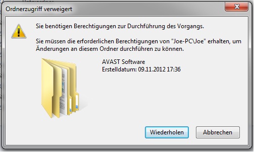 bei der installation gab es dann aber irgendwie probleme und seit dem lässt avast sich nicht mehr installieren. das problem ist aber, dass ich den entsprechenden ordner auch nicht löschen kann... avast hat sich da wohl ein bisschen eingenistet, es kommt immer eine meldung (bild 1) vonwegen adminrechte aber ich habe auf dem pc nur einen benutzer und der ist auch admin.