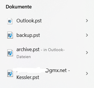 Also die pst-Dateien sind wahrscheinlich im Ordner "Dokumente" (nicht unüblich) und werden nicht als Dokumente angezeigt. Letztlich ist es aber egal, womit du sie verknüpfst und wo sie sich befinden. Wichtig ist, dass du sie jetzt hast.