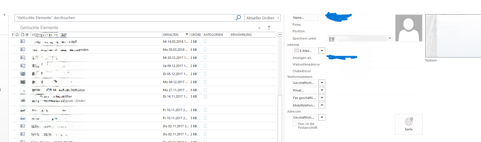Also: Bei der OL-Datendatei, die ich in OL geladen habe, finde ich Adressen im Ordner "Gelöschte Elemente", s. Anhang. Leider kann ich die Adressen (rechte Seite), die mal im Adressordner gespeichert waren nicht mehr dort speichern.