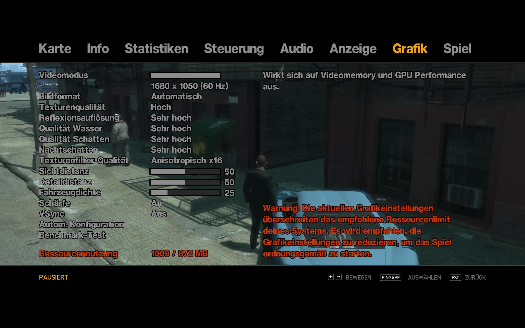 Obwohl meine Einstellungen auf Sehr Hoch sind etc., ist z. B. mein Auto immer kantig. Ich weiß nicht woran das liegt. Nen Kumpel von mir hat die Nvidia GT 9800 mit 1024 GB und bei dem sieht das Bild besser aus und er spielt auch auf Sehr Hoch aber mit Sichtdistanz und Detaildistanz auf 100. Ich denke mal das liegt am Prozessor. Er hat einen Cuad Core mit 3.1