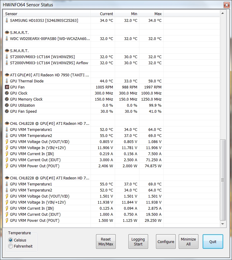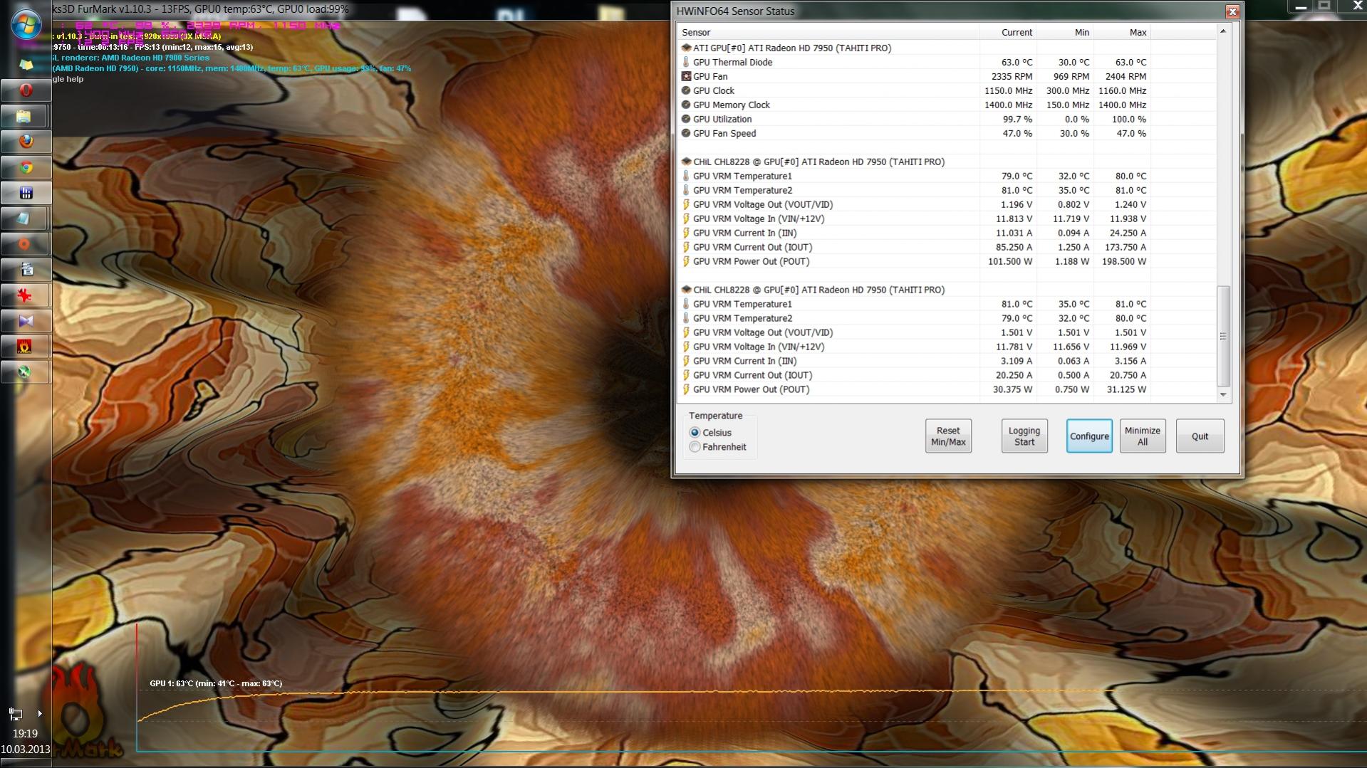 Im HT4U Test wurde die Asus 7950 (V1) im Furmark 15°C wärmer, als unter Spielelast und die Leistungsaufnahme stieg von 148,26W auf 206,49W.