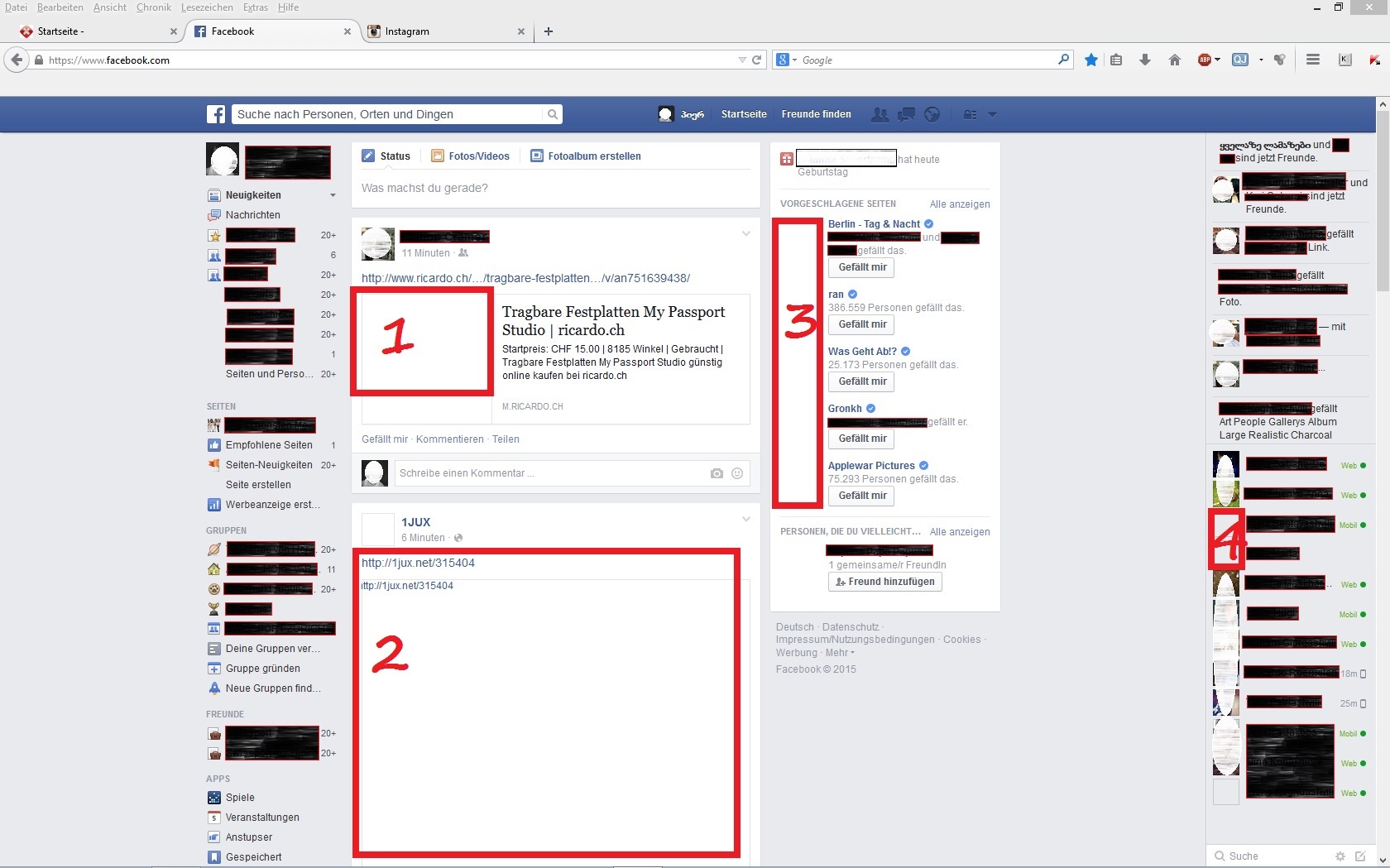 Viele Bilder oder Verlinkungen zu Bildern in Facebook werden weiterhin blockiert oder nicht richtig geladen. Ich habe mal ein Beispiel-Bild gemacht von meinem Facebook. Natürlich aus Datenschutz musste ich Namen und Bilder unkenntlich machen.