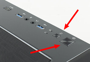 → Minus vom Resetknopf in den Minus-Pin vom Einschalter auf dem Mainboard stecken
