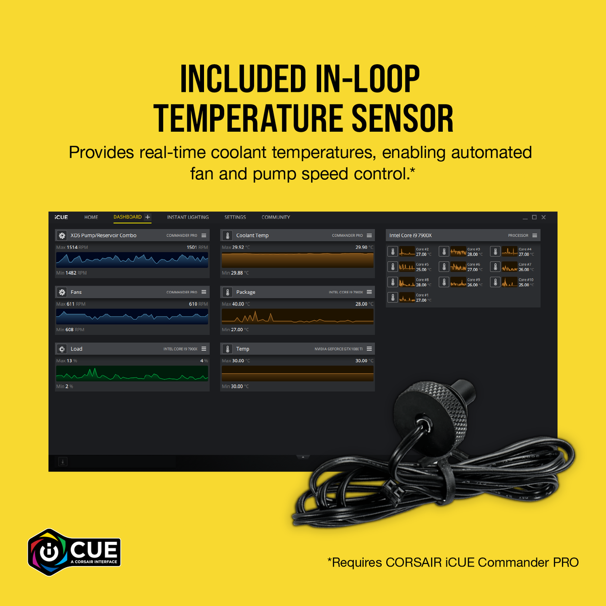 Commander Pro ans MB an einen internen USB Steckplatz , und die Sensoren dann an den Commander. Per iCue auslesen. Die Tempsensoren für WaKü mit zwei Pin Stecker kannst du auch dort einstecken und die Temp auslesen. Ebenso deine LLs die RGB steuern und RPMs
