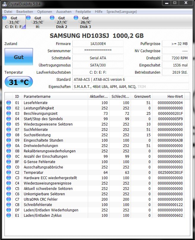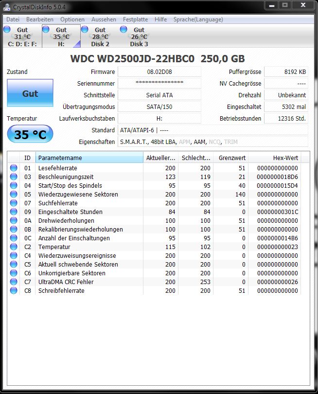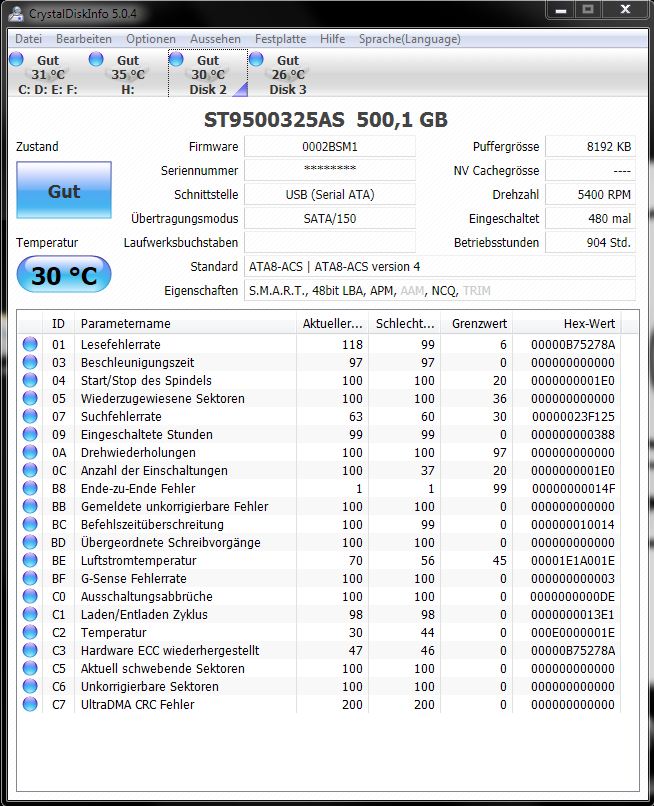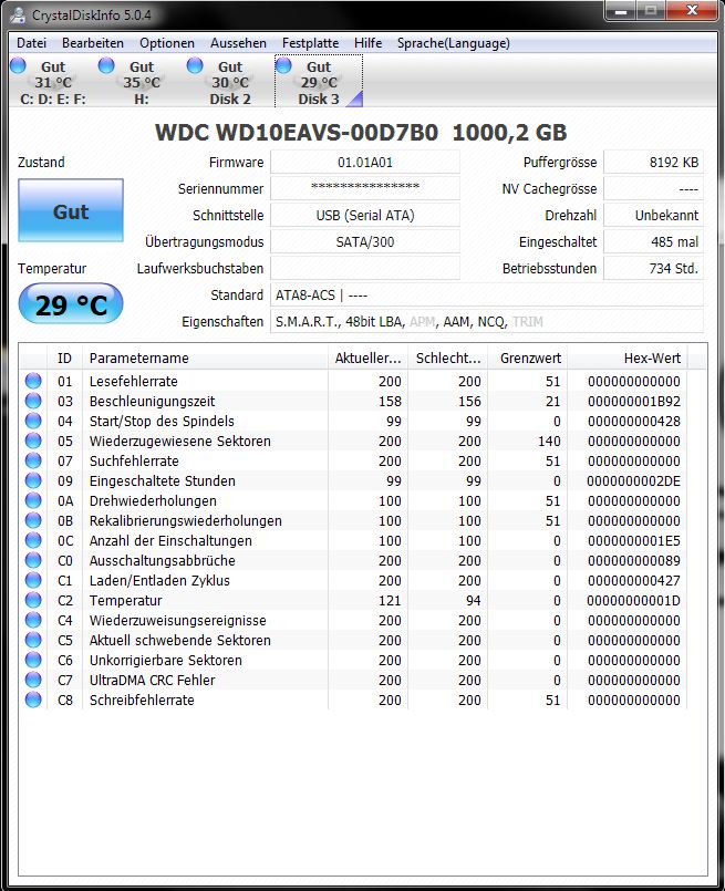 bevor ich die üblichen fragen zum kauf einer neue platte stelle, bitte ich, folgende, ausgelesenen daten mit Crystal Disk Info zu interpretieren. ich stelle mich gerade ein wenig blöd dabei an. hintergrund: meine platten sind schon etwas älter (ich weiß, spielt eine untergeordnete rolle) und ich habe derzeit schiss, dass sie die hufe hochmachen. da natürlich alles durcheinander hier und dort gespeichert wurde, wird wohl eh eine große gekauft werden müssen, damit mal ordnung reinkommt. ist allerdings die frage, wie schnell die gekauft werden muss