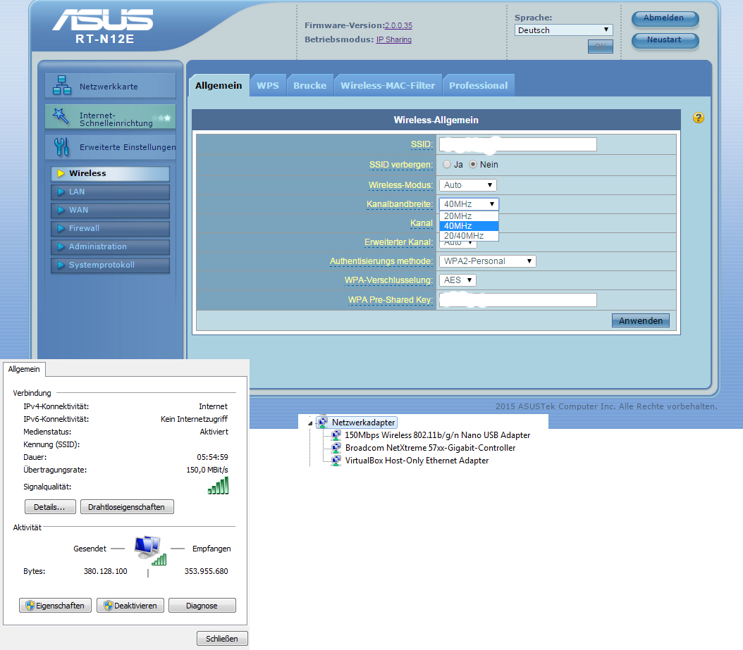 Gegenwärtige haben wir einen noch fast neuen ASUS RT-N12E (300Mbit/s). Der Router muckt aber irgendwie rum. Seltsamerweise ist mein WLAN-Drucker in Verbindung mit meinem Desktop-Rechner furchtbar langsam. Mein 150Mbit/s Stick (nano von Edimax) könnte das Problem sein, da laut Windows nur 72Mbit/s durchkommen. Beim Notebook meines Mitbewohners kommen ca 142Mbit/s durch. Nun habe ich eben die WLAN-Settings des Router geändert. Dort stand Kanalbandbreite auf 20MHz/40MHz. Diese habe ich auf (nur) 40MHz gestellt und urplötzlich hatte ich an meinem Desktop-PC 150Mbit/s Durchsatz und das Notebook nur noch < 70MBit/s. Das ist doch total seltsam. Bei mir ist das Internet aber plötzlich auch deutlich schneller; bei meinem Mitbewohner deutlich langsamer. Das ist doch total seltsam so?!