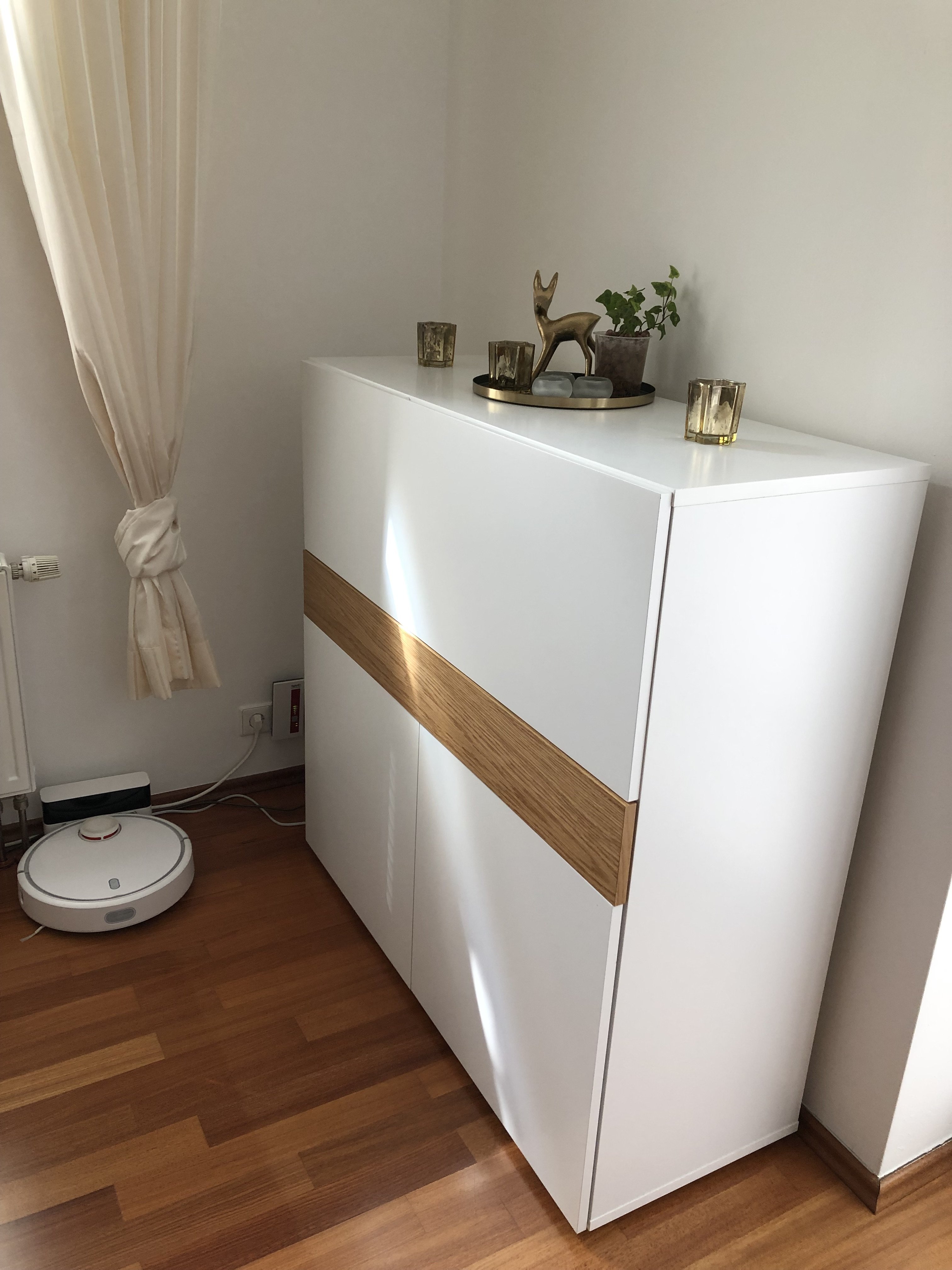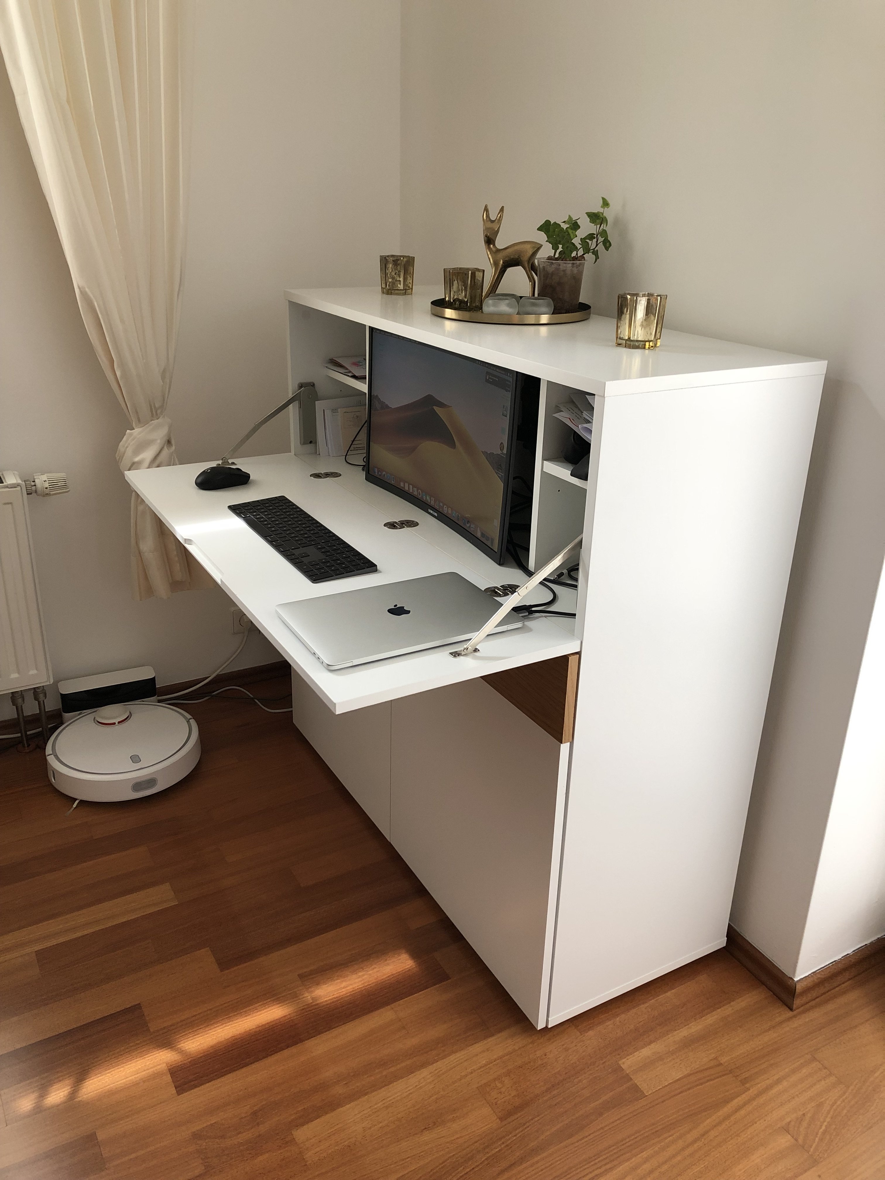 eine kleine Hürde gibts leider noch: der Monitor darf nicht höher als 35cm sein (nur der Bildschirm selbst), weil er sonst nicht in den Sekretär passt, siehe Bilder. Breite um die 60cm wäre ok, +/- ein paar cm. Bis irgendwann mal das Eigenheim kommt muss ich mit der Lösung leben.