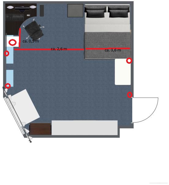 Ich habe bei den Zeichnungen das Problem, Sitzposition am Schreibtisch, - den LED an der Wand und die Sitzposition aufm Bett bei 5.1 unter einen Hut zu bekommen. Betrachte ich den LED als Mittelpunkt eines 5.1 Systems, wieviel Platz ist nach rechts?