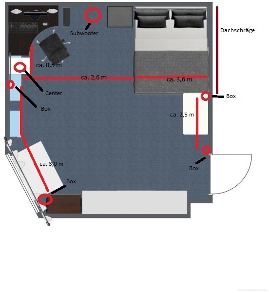 Um nun die für Stereo aber auch Heimkino erforderliche Stereodreieck Aufstellung der Front zu erreichen, können die Lautsprecher Vorne Links/Rechts nicht weit genug von einander Weg aufgestellt werden. Denn du hast keine (laut deiner Zeichnung) 2,60 Meter Platz um die Boxen soweit von einander weg zu stellen wie du sitzt. Denn bedenke der Center ist die Mitte und die Boxen links/rechts sollten die gleiche Entfernung zueinander UND dir(!) haben. Denn der AVR kann das nur begrenzt bei der Einmessung ausgleichen. Damit du besser nachvollziehen kannst hier ein Bild als Vergleich wo auch jemand eine Schräge hat ABER die Einrichtung soweit versetzt ist das es trotzdem geht. Da die Schräge links, der AVR durch Senkung des Pegels ausgleichen kann (die Wand/Schräge wirkt wie ein Trichter wodurch die Linke Box lauter spielt ohne Anpassung) aber die Frontlautsprecher zueinander und dem Zuhörer die richtige Entfernung haben.