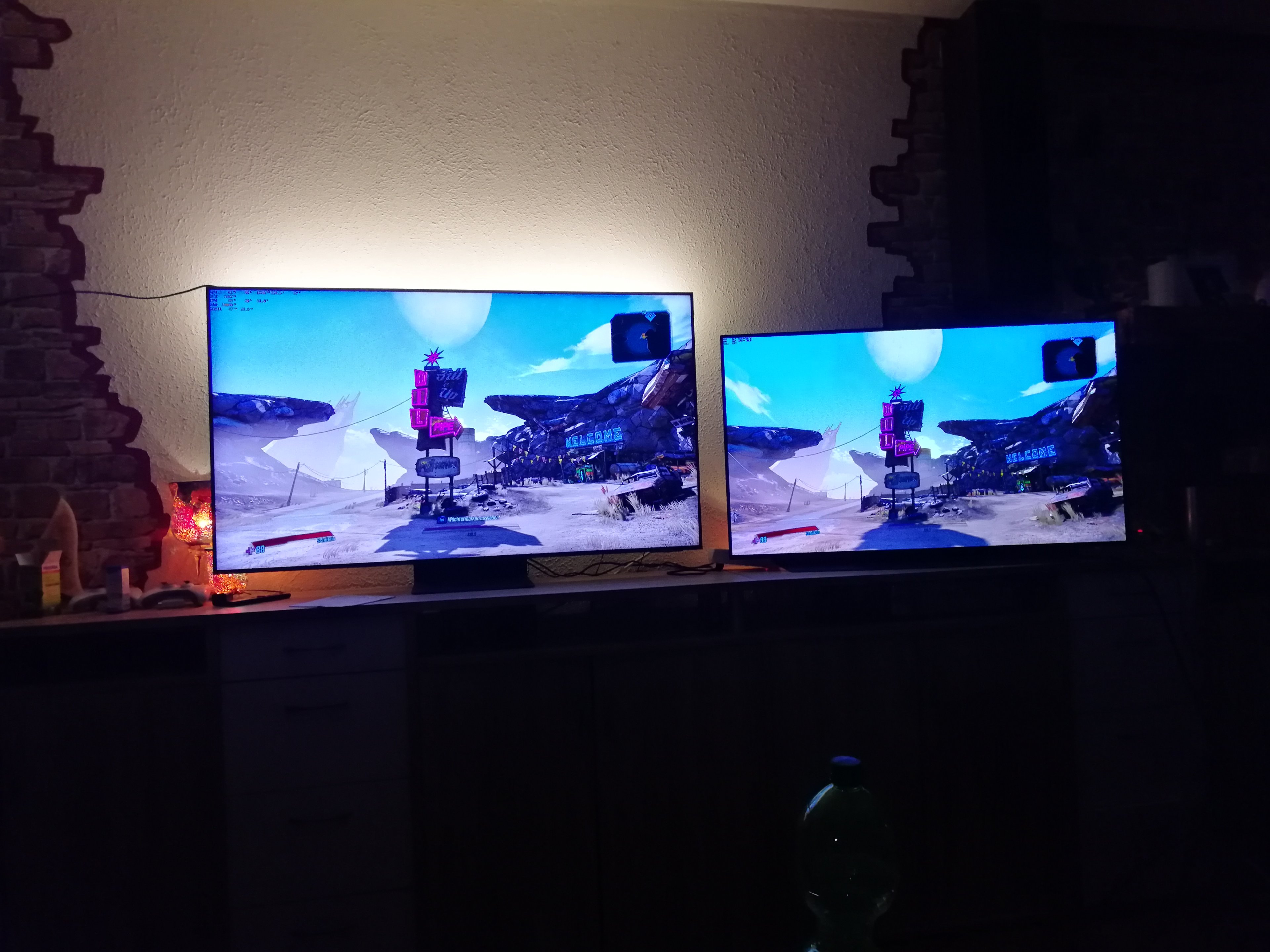Man beache den wie die Details in den Dunklen stellen beim Oled einfach absaufen [rechts C1 48 und links 93b 55]. Auch wenn meine Cam hier nicht wirklich gute Bilder macht, ist der Detailverlust deutlich. Sicher, könnte ja den Blackstabilizer erhöhen, nur hebt das die Gesamthelligkeit mit an und es wird immer milchiger. Nebenbei, der Himmel ist richtig geil blau beim Qled, eher türkis beim Oled. Oled läuft auf max, der Qled grad mal auf Helligigkeit 20 von 50 [was ca der vom Oled @ max entspricht]. Exakt bei diesem Bild zieht der Oled übrigens bei 48 Zoll 93W aus der Dose. Der Qled mit 55 Zoll 64W.