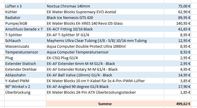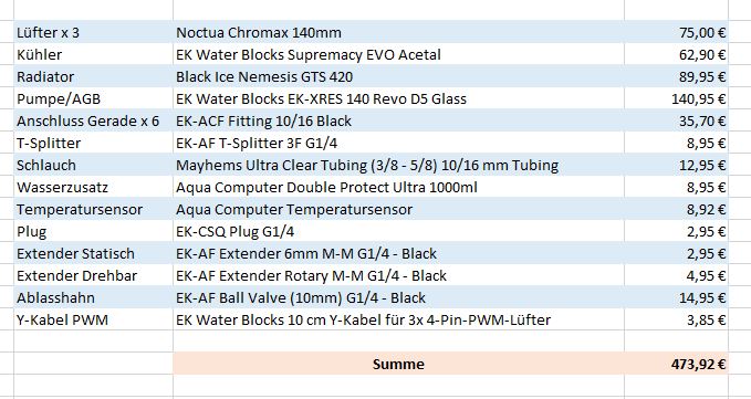 Ich würde die gewinkelten Fittings nur bei Bedarf noch nachkaufen. Rein zur Sicherheit jeweils 2-3 kaufen ist es mir nicht wert. Am Ende brauche ich diese nicht und die liegen nur herum und haben meinen Geldbeutel belastet Ich kann mir klar vorstellen, dass die hier und da sinnvoll und eventuell notwendig werden könnten, vor allem damit der Schlauch nicht die Graka berührt, aber das muss ich dann erst sehen, wenn ich am basteln bin. Aber wenn wer natürlich direkt sagen kann, dass so ein gewinkelter Anschluss an einer Stelle bei mir wirklich notwendig werden würde, dann würde ich den entsprechenden Fitting natürlich noch meiner Liste hinzufügen.