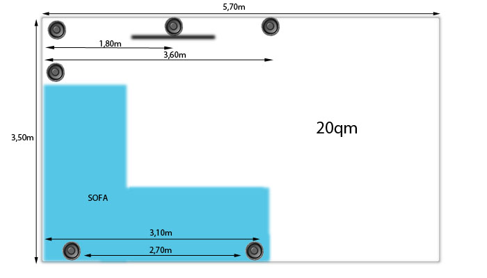 Zur besseren Veranschaulichung habe ich in der Skizze meine derzeitige Boxenaufstellung inkl. Entfernungen gekennzeichnet.