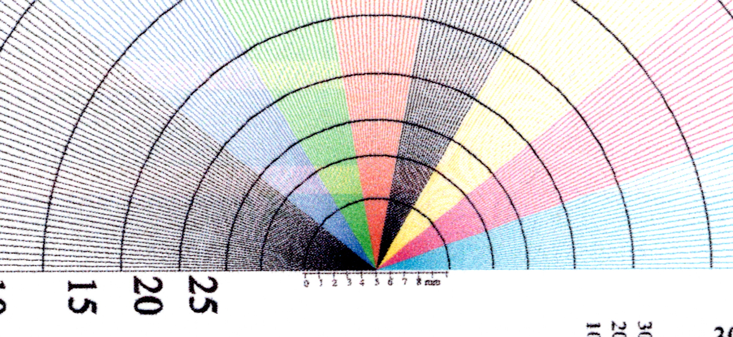 Edit: Ich habe den Strahlenkranz auch mal getestet und mit 600dpi eingescannt. Von der Schwarzdeckung und der Lesbarkeit muss sich der Drucker nicht hinter dem Laser verstecken. Man sieht, dass mindestens für Blau und Grün einige Düsen manchmal eine schlechte Performance bieten.