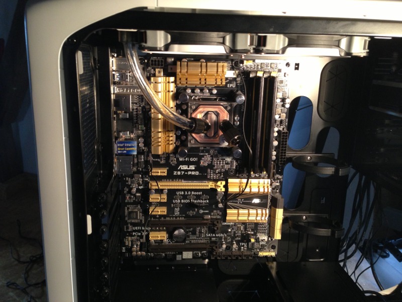 Wenn ich mir eine richtige Wasserkühlung zulege, würde ich auf jeden Fall den Radiator auf die Rückseite des Pc schrauben. Sprich, auf die Klappe mit der man zum Kabelmanagement gelangt. ( So in etwa