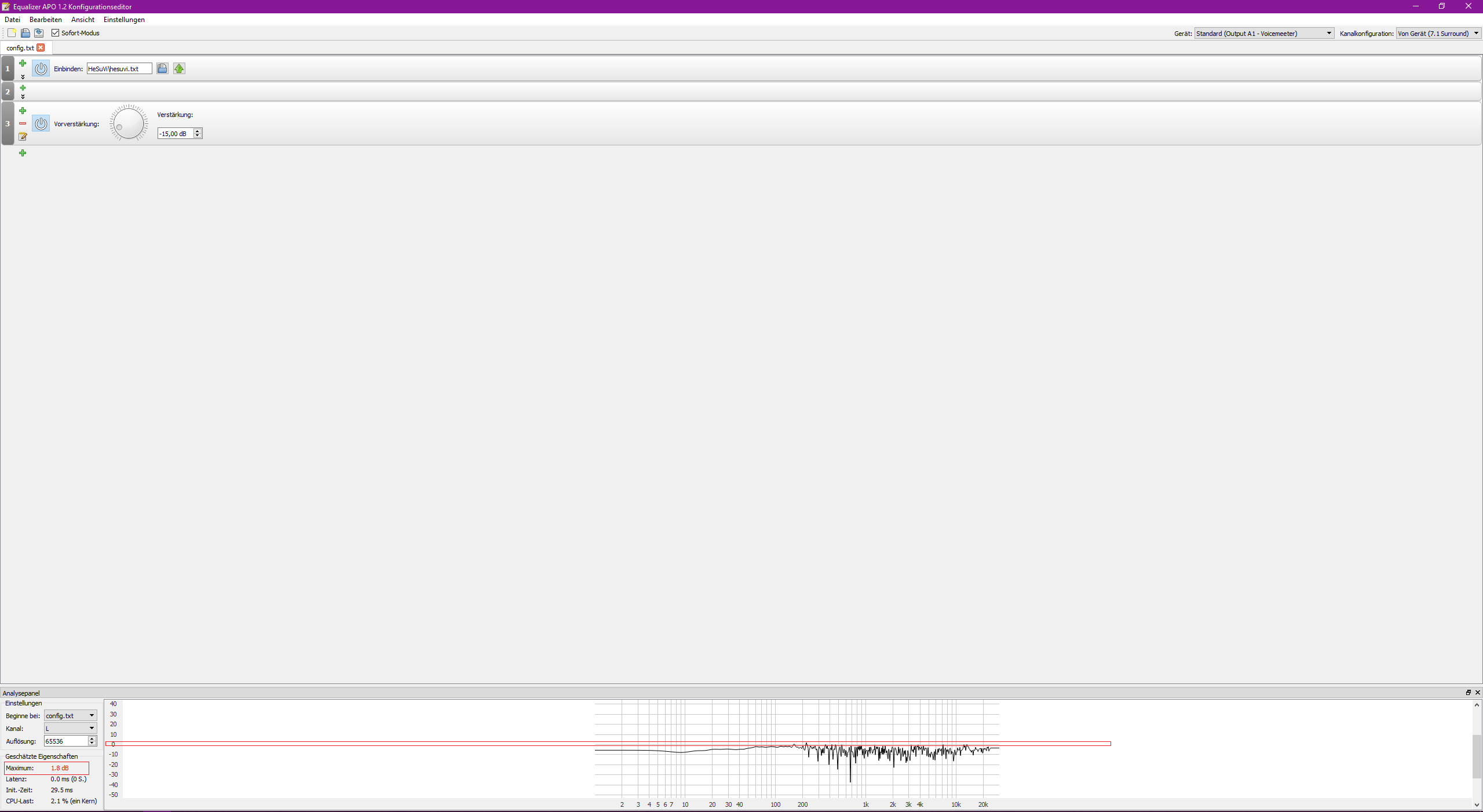 In dem Beispiel hab ich trotz - 15 DB immer noch einen digitalen Peak von + 1,8 DB. Heißt wenn ich Audio abspiele und in dem Bereich von 220 HZ wird ein Ton mit sehr wenig Headroom wiedergegeben, hab ich Informationsverlust/Clipping. Bei + 1,8 DB und dann auch nur in einem Frequenzbereich fällt das nicht auf und ist zu vernachlässigen. Hat man keine gescheite analoge Verstärkung kann man Kopfhörer Surround ohne Clipping eh nicht nutzen wenn man es LAUT oder zumindest nicht ziemlich leise haben will. In der Regel wird bei wahrscheinlich allen Soundkarten Clipping verwendet um den Surround nutzen zu können. Sprich es wird digital angehoben, das galt auch für meine Asus xonar Essence STX. Da hat sich auch an der Lautstärke nichts verändert beim aktivieren von Dolby Headphone. Naja, jenachdem ist das zu vernachlässigen, bei meiner Soundblaster Z hat man aber schon leichtes verzerren gehört.
