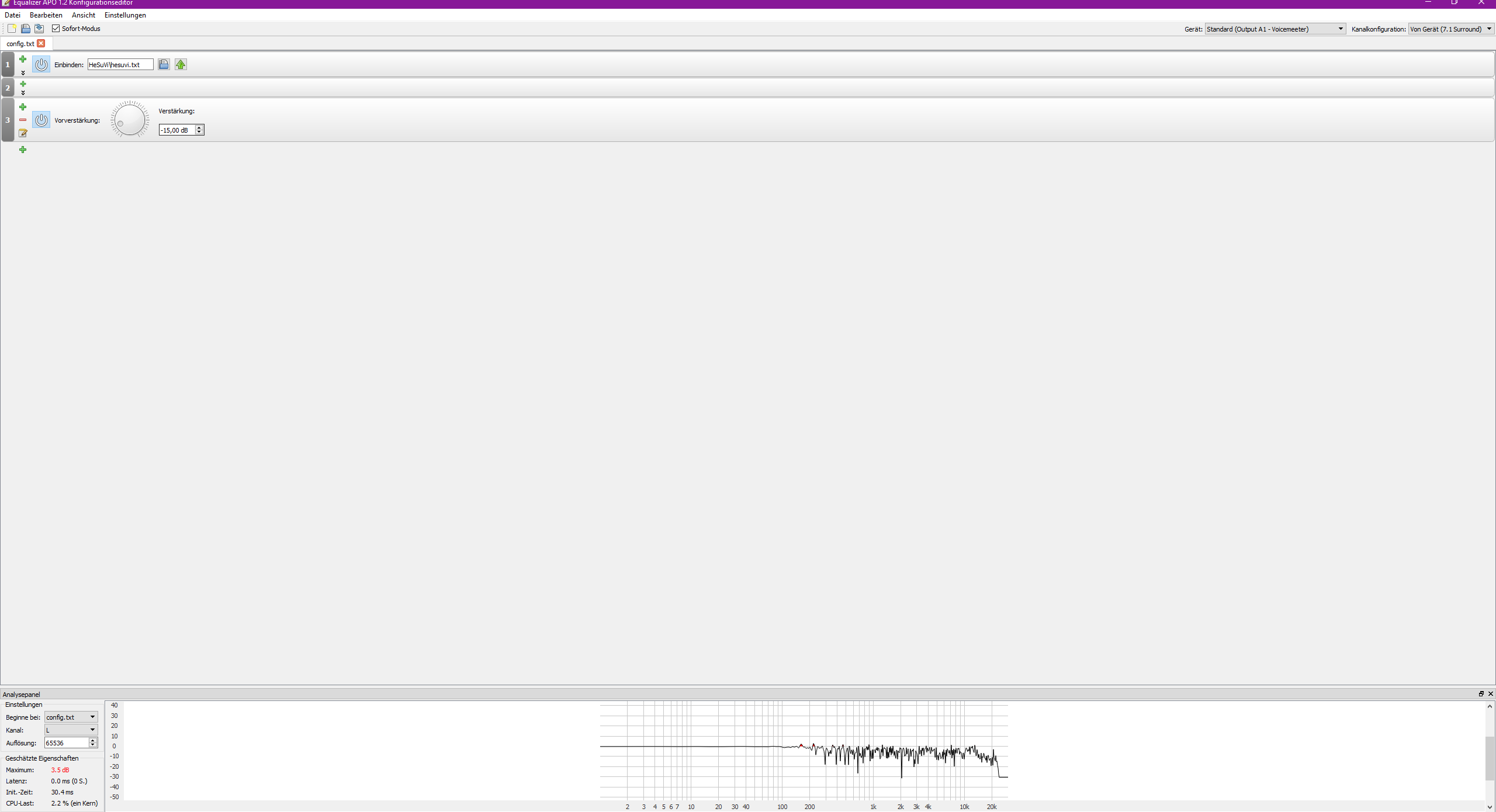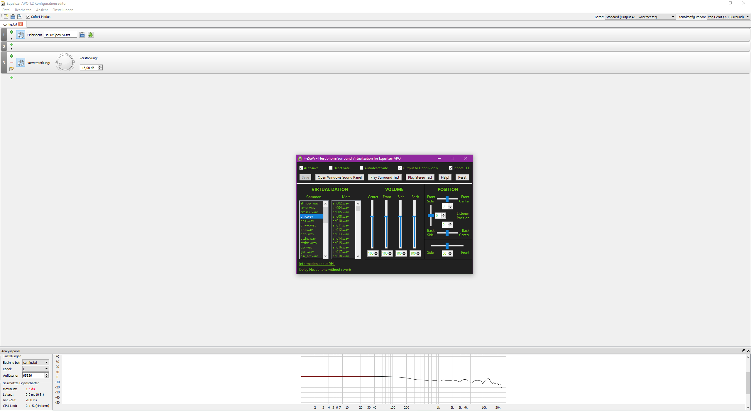 Aja, ein weiteres Problem ist Lautstärkeverlust. Will man Clipping vermeiden muss man bei allen Surround Simulationen einen negativen Preamp verwenden.