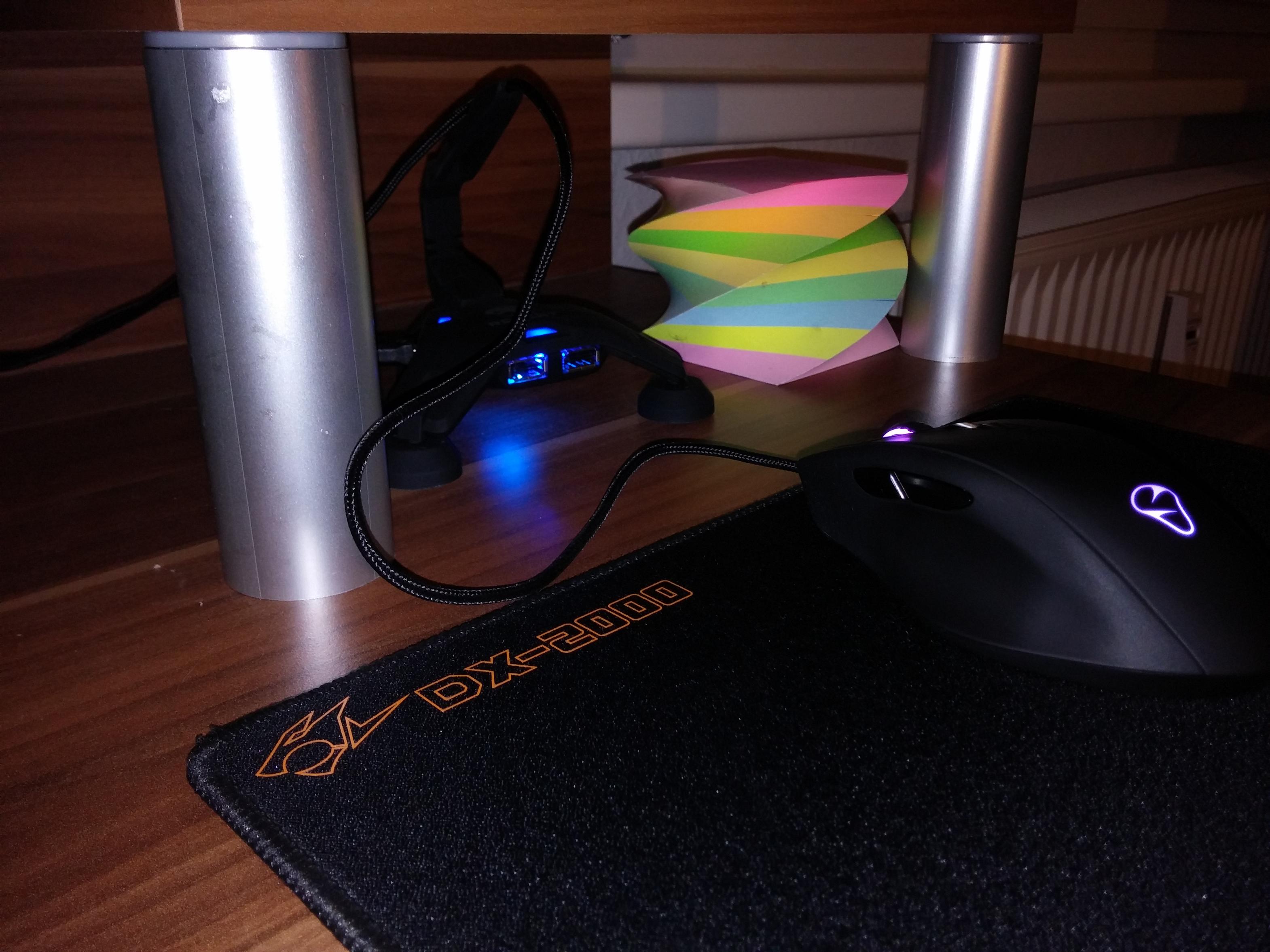 Ich hab das Bungee leicht schräg stehen, da merkt man die Schlaufe nicht. Wobei ich prinzipell auch ohne so einem Teil auskommen würde solange die Maus auf dem Tisch irgendwo angeschlossen ist (z.B. USB Port an der Tastatur). Hauptsache das Kabel zieht nicht weil es vom Tisch runter hängt. Das Roccat Teil hab ich mir eigentlich nur gekauft weil ich nen standfesten Hub für den Tisch wollte ;-)