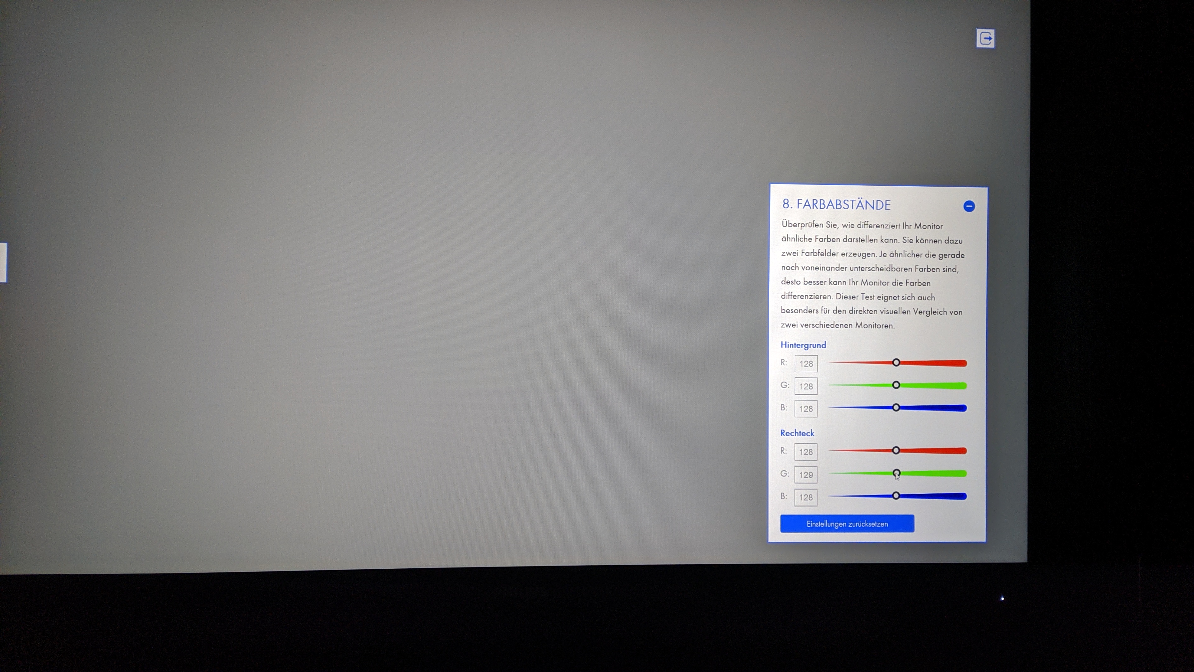 Farbabstände sind jeweils bei R,G,B=128 zu R,G=128,B=129 zu erkennen, analog bei Variation einer anderen Farbe