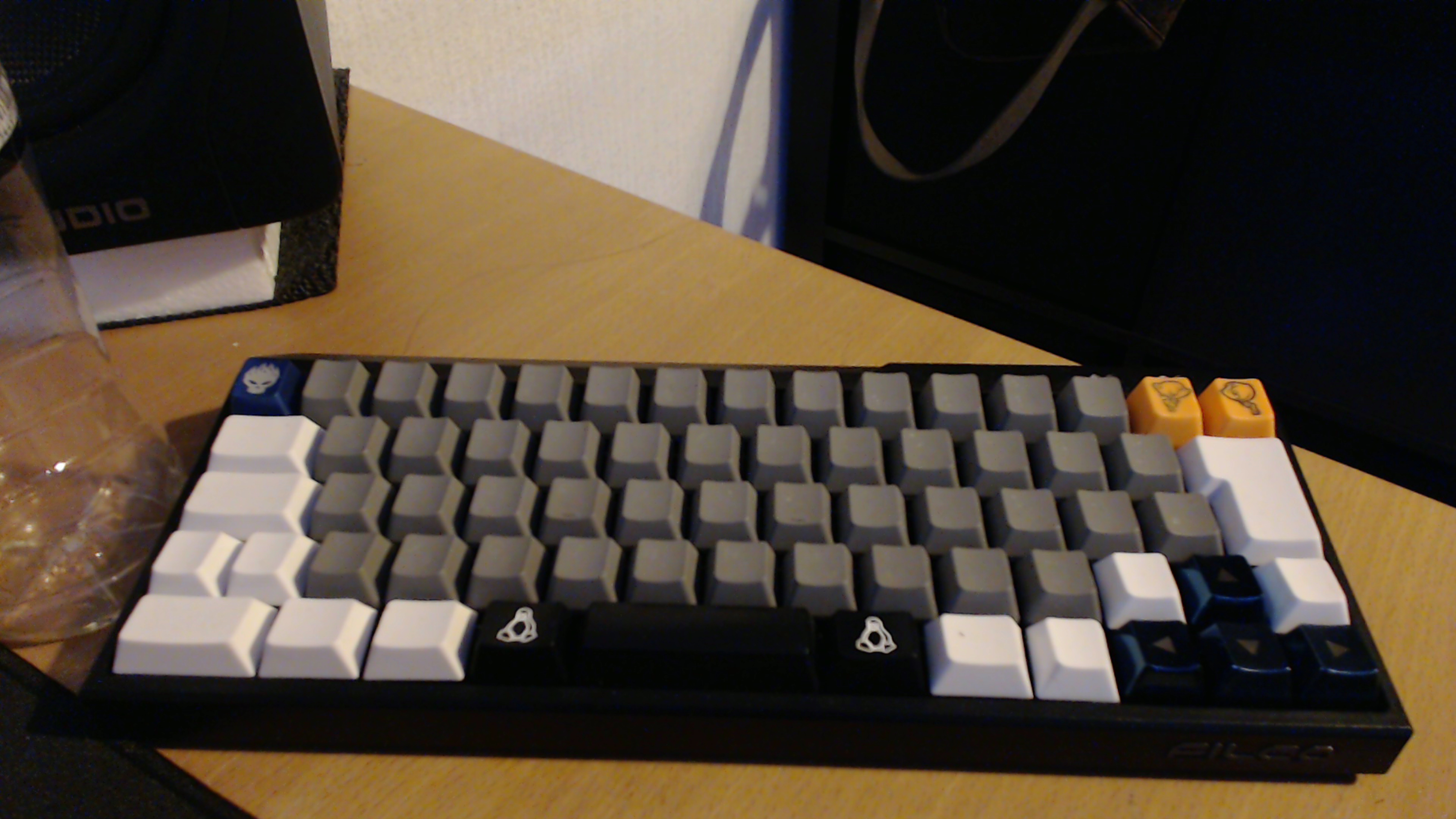 Ich werde die weißen Caps noch violett färben, bis auf die Spacebar und die 2 Linuxtasten daneben ist alles PBT. Ok, die Pfeiltasten und Esc sind auf dem Bild noch Metallcaps (Alu und Zink?) Also es geht, aber man muss schon ein wenig keysets zusammenkippen oder einfach mit den ABS Caps klarkommen, die ab un zu gar net verkehrt sind, wenn man die Bedienung noch net ganz verinnerlich hat, läuft ja auch viel über FN-Keys, etc.