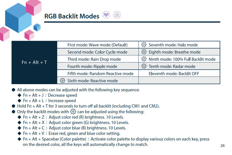 Probier mal den Reactive Mode oder Raindrop Mode aus, falls vorhanden. Reactive heißt, die Beleuchtung ist aus, solange nicht getippt wird und angeschlagene Tasten reagieren mit einem kurzen "Lichtblitz". In einer frei wählbaren, aber immer gleichen Farbe, as far as I remember...