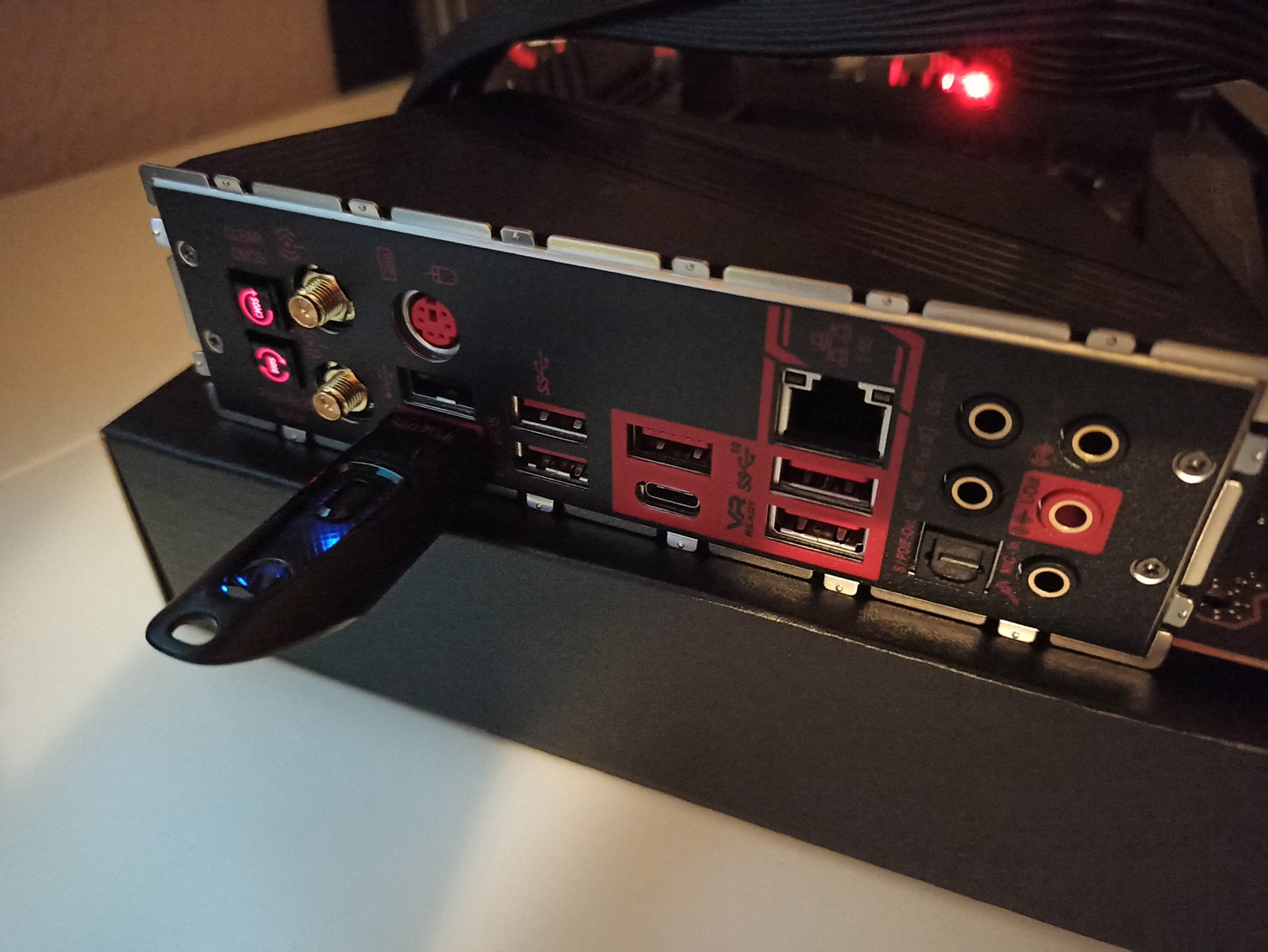 USB-Stick rein und den Flash Bios Button gedrück (siehe Bild). Der Button blinkt dann. Sobald das flashen fertig ist, hört der Button auf zu blinken. Dann schaltet sich das Mainboard kurz aus und wieder an. Hab dann den EIN-/Aus-Schalter am Netzteil betätigt.