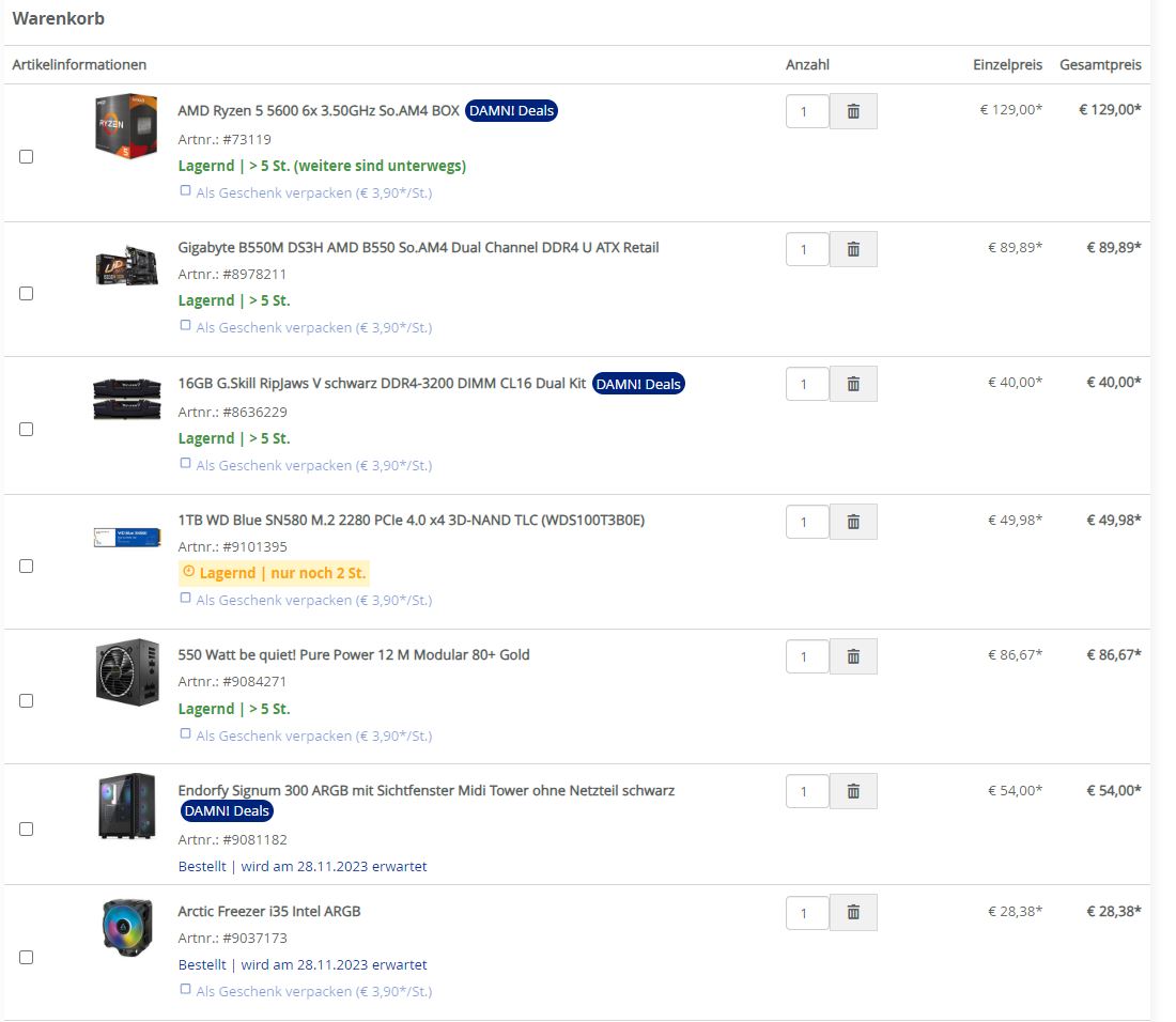 Ich habe mir anhand der Empfehlungsliste bisher die folgenden Komponenten ausgesucht. Hinzu kommt noch die RX6650 XT.