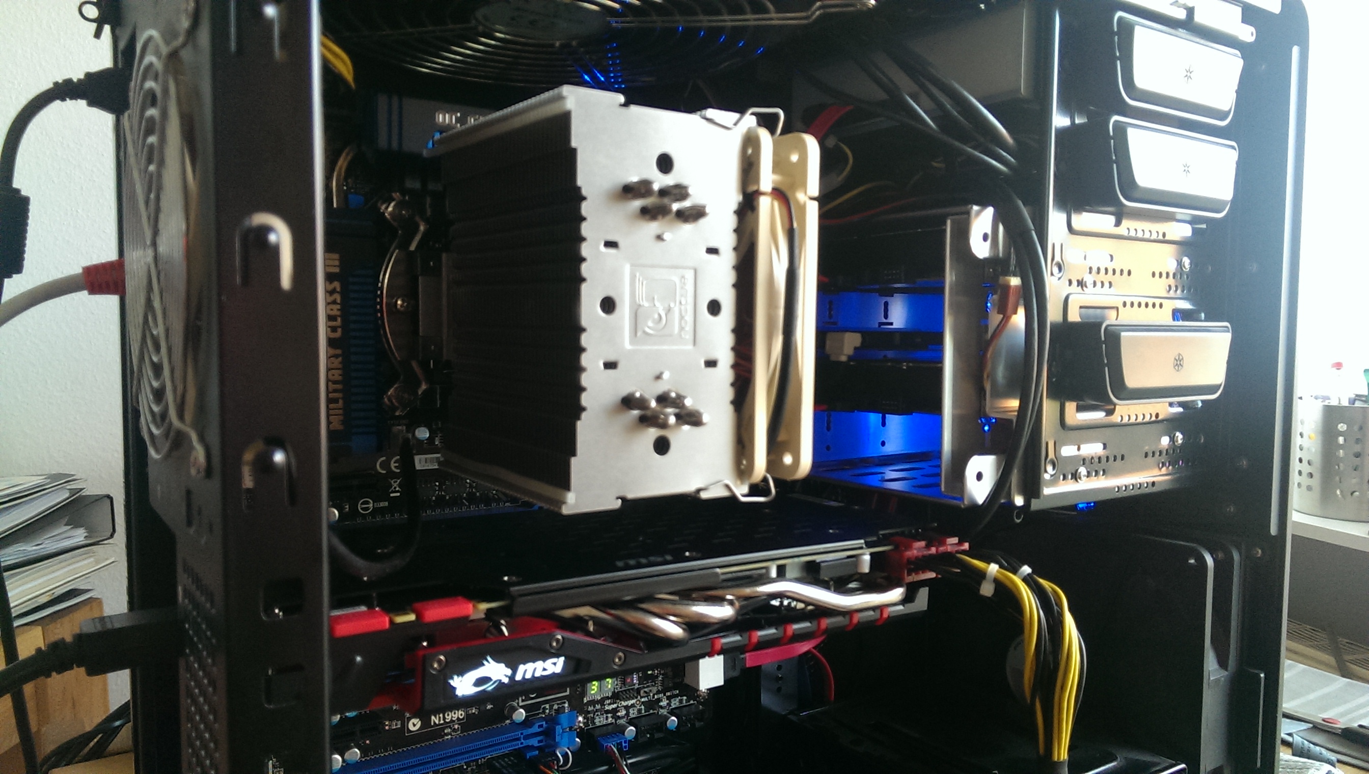 So, quasi als finalen Akt und weil heute die Kabelbinder eingetroffen sind, hab ich mein Gehäuse so gut wie es mir möglich war optimiert. Ehrlich gesagt wars noch nie so sauber und aufgeräumt wie jetz. Netzteil hab ich nun gedreht (saugt vom Boden an und bläst nach hinten raus, keinerlei Störung der Luftkanäle im Gehäuse), Kabel aus dem Weg geräumt und ins unsichtbare verfrachtet.