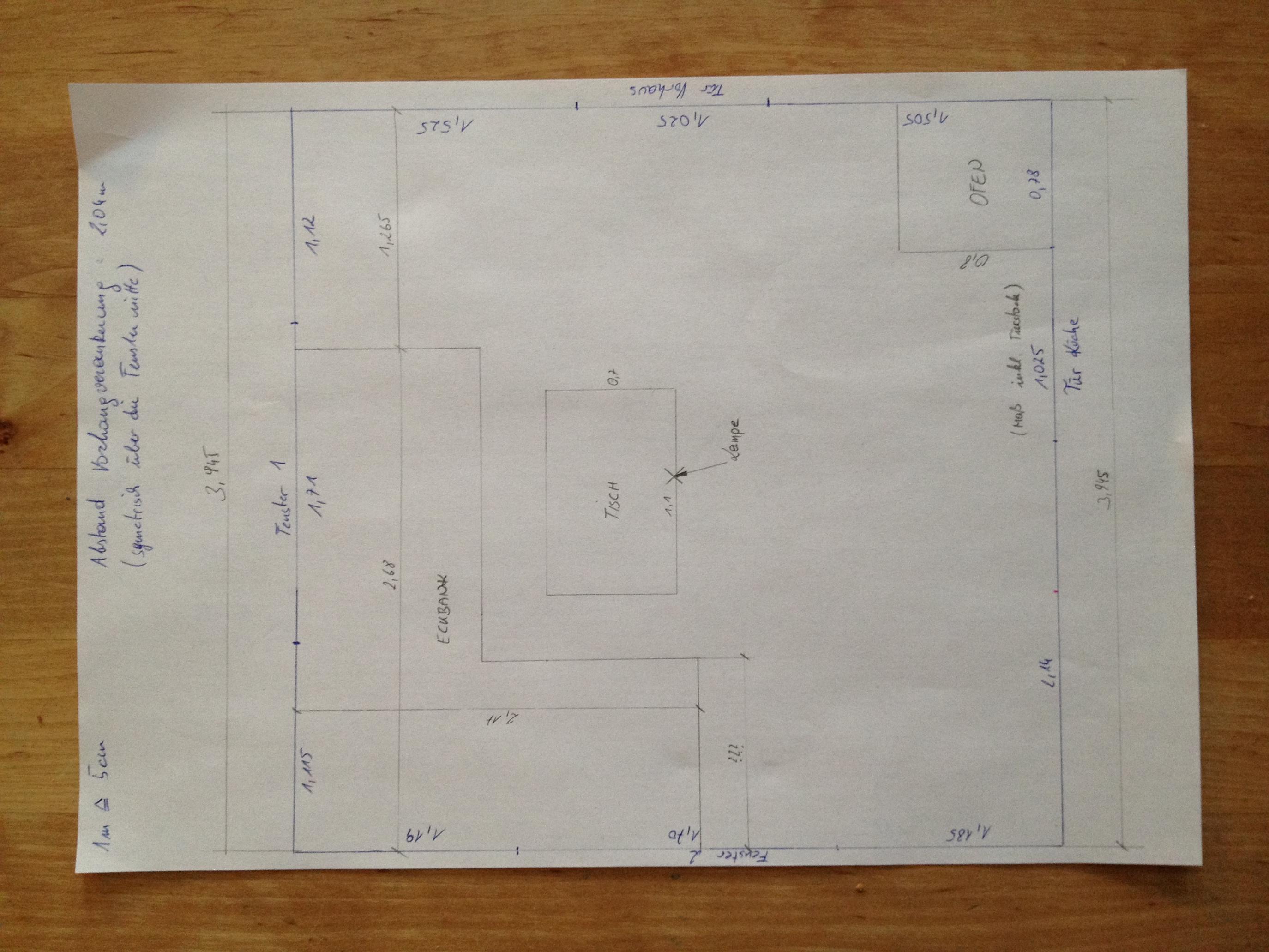 Erzähle von der 2 Meter breiten Wand, an die der TV kommt und das "zukünftige gesuchte" Soundsystem, von den 3 Meter Hörabstand und dem Sofa an der Wand in der Ecke ...