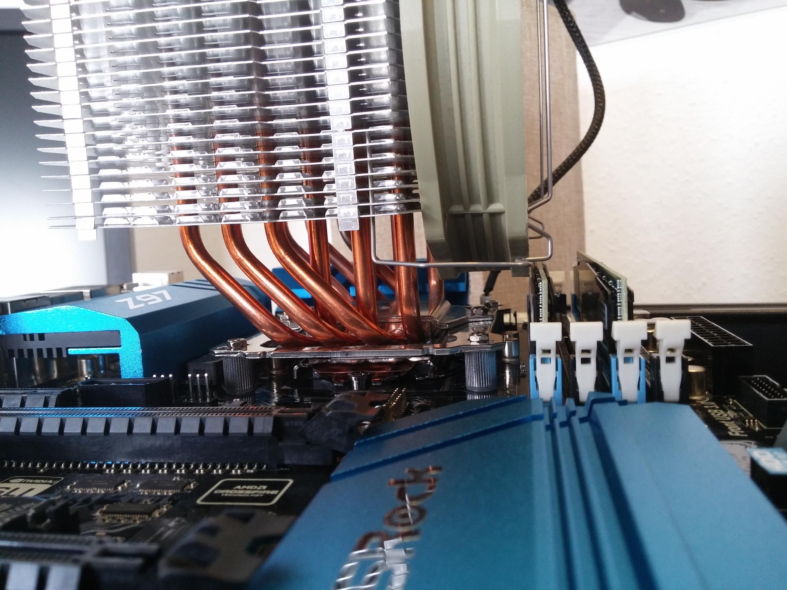 Du weißt schon, dass du den Lüfter beim Macho noch nach oben schieben kannst...? Noch mehr als genug Spielraum bei der Lüfterhalteklammer. Habe einen auf einem Fm2 Board einen Macho über http://geizhals.de/g-skill-ripjawsx-dimm-kit-8gb-f3-17000cl11d-8gbxl-a639751.html montiert. Das war dann wirklich knapp.