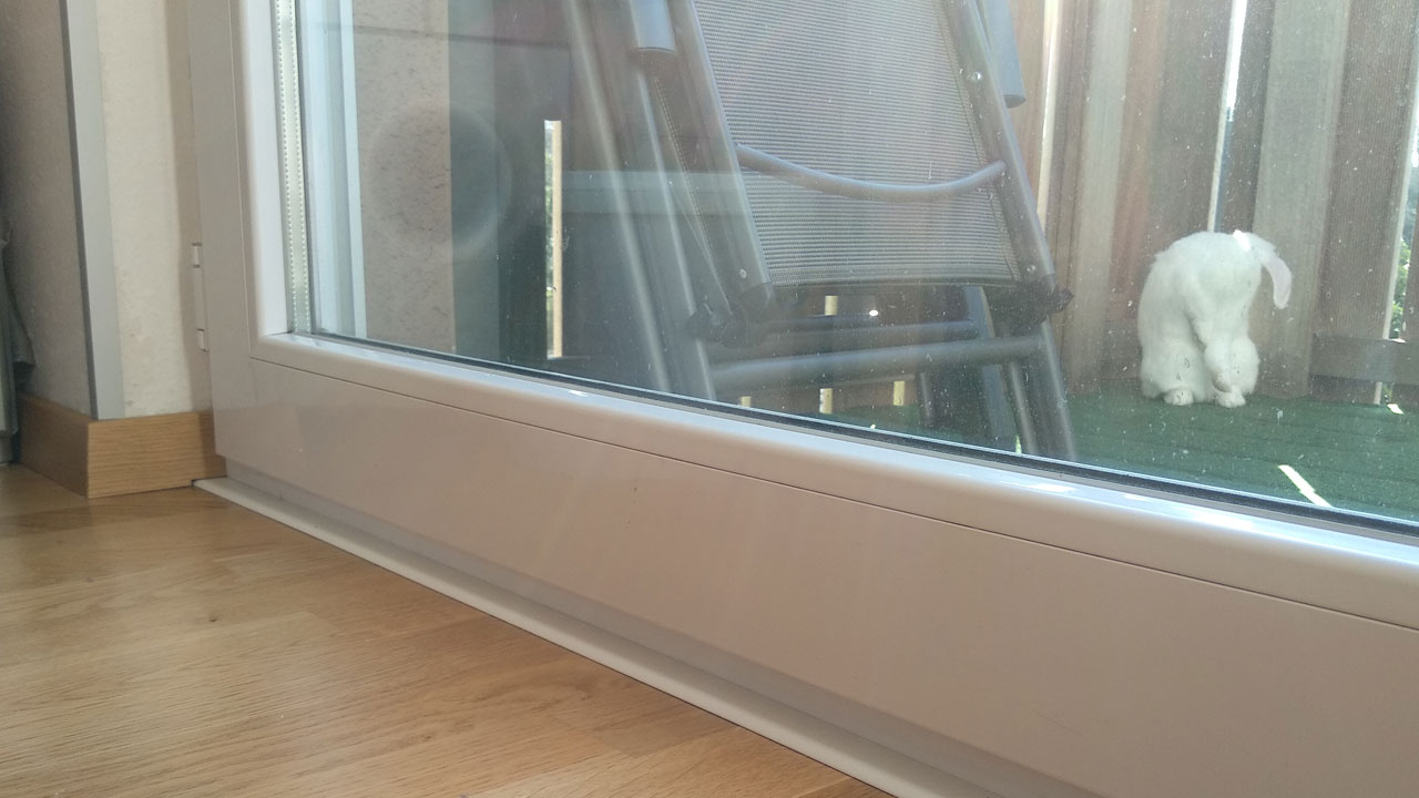 Option #1 sieht vor 2 Kabel durch einen Kabelkanal (unschön) an der Wand doch und oberhalb einer Doppelflügel-Balkontür entlang zu legen.
