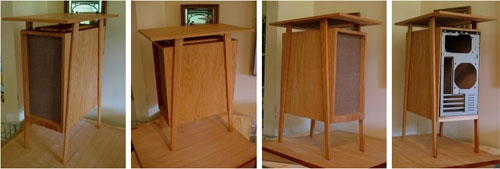 Damit Ihr es Euch besser vorstellen könnt. Holzgehäuse ungefähr so (anders aufgebaut hinsichtlich der Be- und Entlüftung, aber vom Grundsatz her: Aussen ein Holzgehäuse, das Bestandteil eines rollbaren Schränkchens mit Integriertem Soundsystem, aufgesetztem Ergotron LX Monitorhalter und Schubfach für Tastatur und Maus.