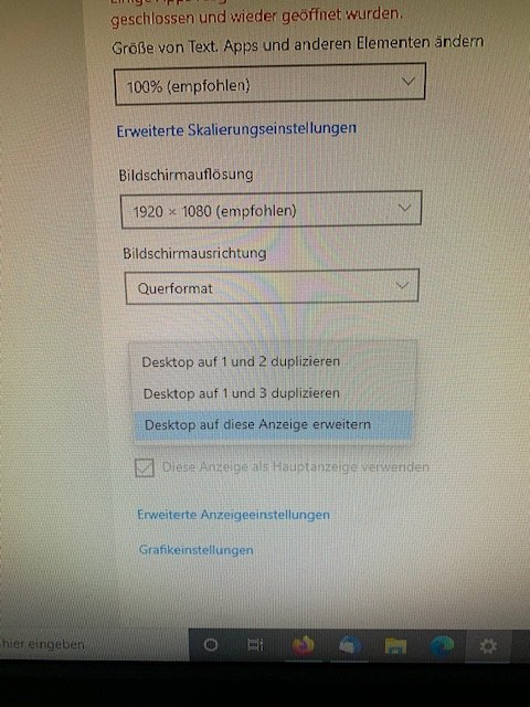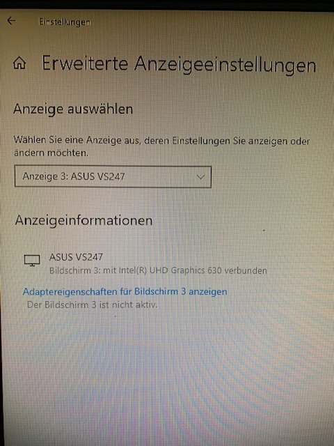 Die Anzeigeneinstellung von WIN10 erkennt zwar, dass 4 Monitore angeschlossen sind (auch mit der richtigen Modellbezeichnung), aber 2 werden als "inaktiv" angezeigt.
