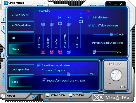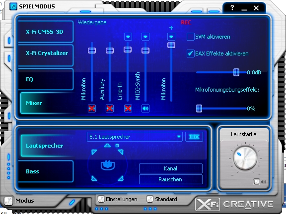 Das sind jetzt die Bilder von meiner Soundkarte. Auch wenn es eine AuzenTech X-Fi Forte 7.1 ist. So ist es im Kern trotzdem eine X-FI und der Grundtreiber ist von Creative wie man unschwer an den Bildern erkennen kann identisch. Ich habe immer den Spielmodus aktiv. Ich meine in den anderen Modi ändert sich die Darstellung der Menüs etwas. Im Zweifelsfall ändere den Modus kurz auf den Spielmodus und dann nach der korrekten Einstellung wieder zurück wenn du die Optionen so nicht findest.