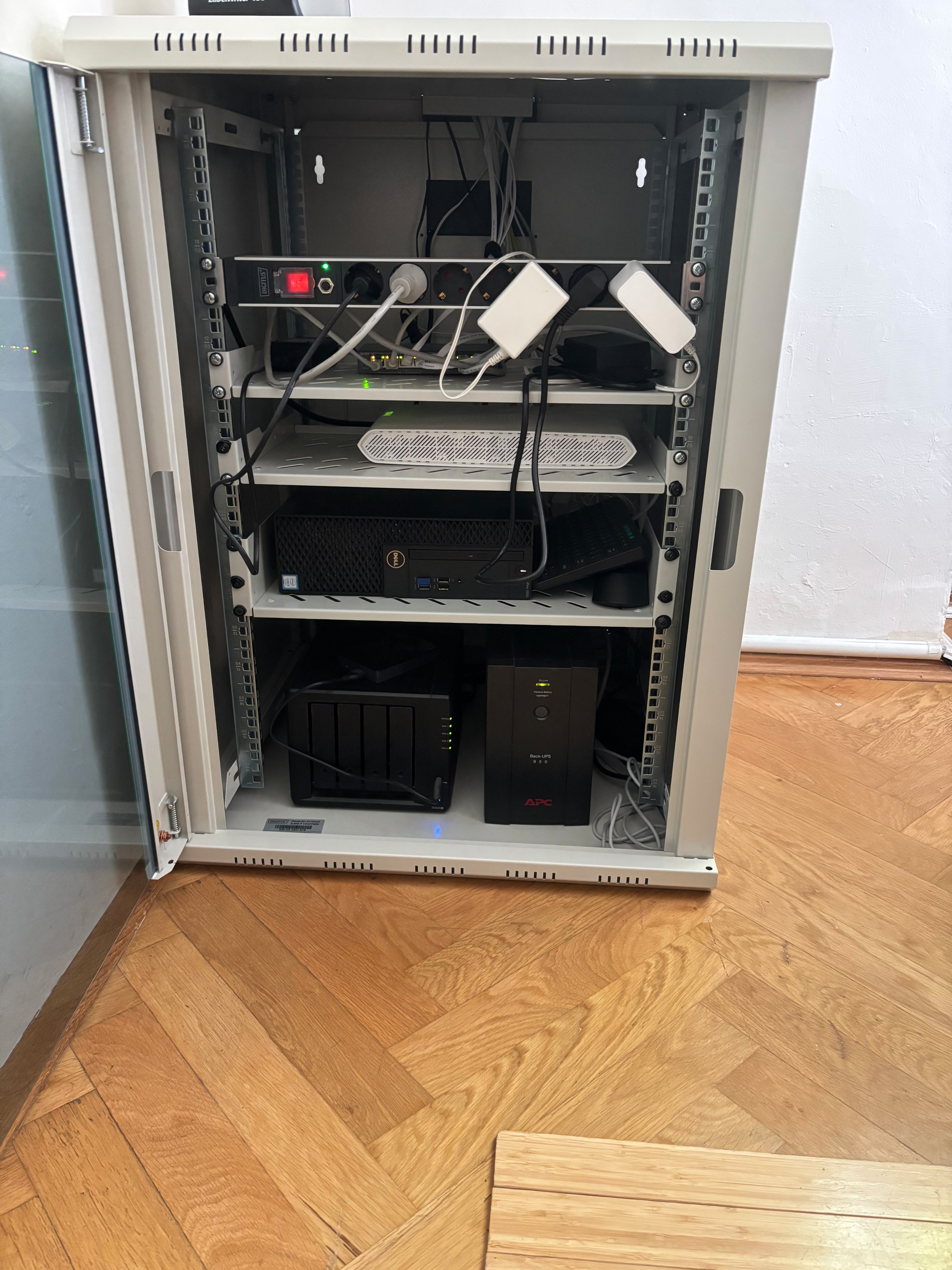 wir in der Arbeit (Berufsverband) ohne eigenständige IT wollen endlich unsere elektronische Geräte in ein Netzwerkschrank bündeln, der auf dem Boden steht (oder auf ein entsprechendes Gestell bzw. mit Rollen, Wandmontage eher nicht möglich). Bei der Höhe tendieren wir zu 9 HE bzw. 15 HE (bevorzugt wegen der Höhe?). Es wären folgende Komponenten unterzubringen: