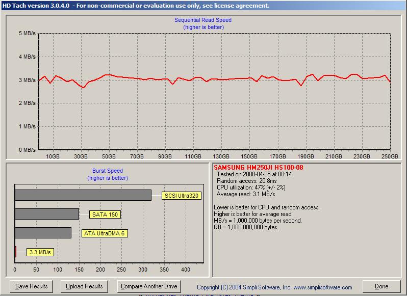 EDIT2: Also den HD Tach Test habe ich an einem anderen Rechner gemacht wo die Platte am 2. SATA Port hing. Der Chipsatz dort Via oder SiS kann nich so wirklich mit der platte umgehen und hat dementsprechend nur 3mb/s Transferleistung. :(