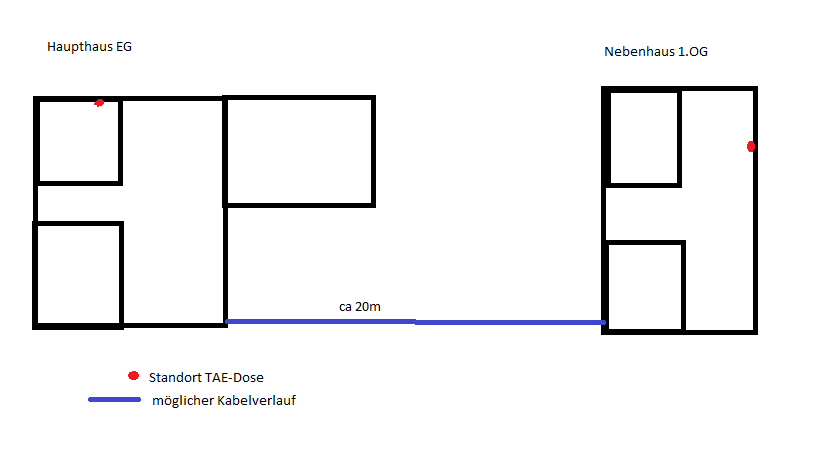 Ein Netzwerkkabel und ein Telefonkabel von Haupt- zu Nebenhaus legen, an das dann im Nebenhaus ein weiterer Accesspoint bzw. eine weitere DECT-Basis (wie ist das dann mit dem Übergang von Haupt- zum Nebenhaus?) angeschlossen wird.