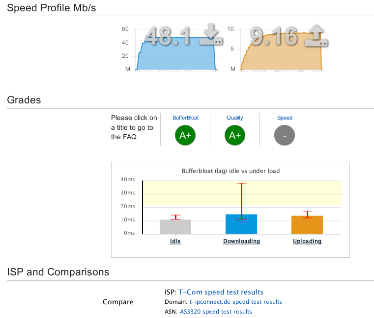 Uridium schrieb:Das nennt man 'Bufferbloat' und ist ein bekanntes Problem. Eine der derzeit besten Lösungen heißt SQM (Smart Queue Management). Der dort verlinkte Speedtest kann den Bufferbloat recht zuverlässig anzeigen.