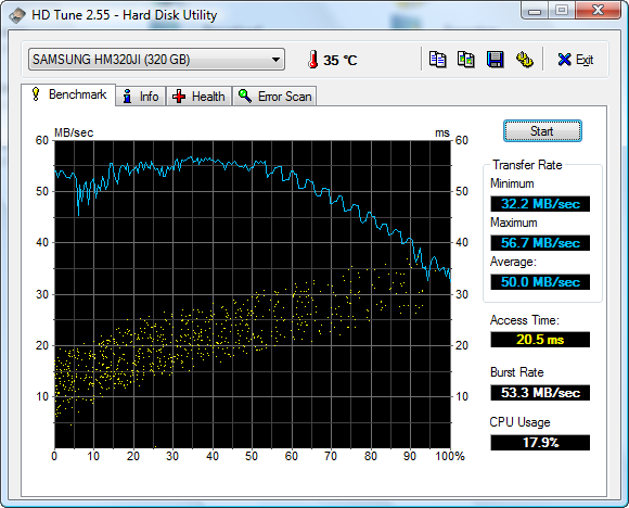 Derzeit ist von Dell die Samsung SpinPoint M6 HM320JI 320 GB 12 ms / 8 MB / 5400 1/min verbaut, die ist meiner Meinung nach nicht die schnellste (siehe Screenshot) und macht halt ständig diese "Klick-Klack-Geräusche".