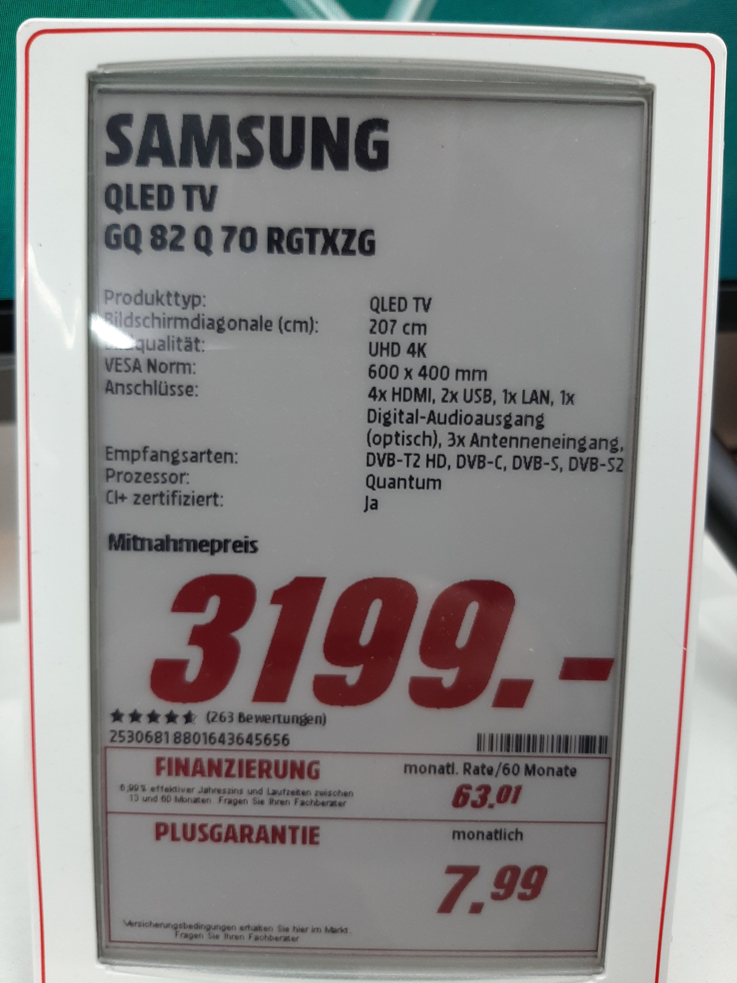 Hatte mir bereits den Samsung GQ82Q 70 RGTXZG QLED (ComputerBase) rausgesucht. Dieser wurde mir im Winter 2019 bei MediaMark für 2.900,00€ angeboten, aktuell finde ich kein Angebot unter 3.300,00€.