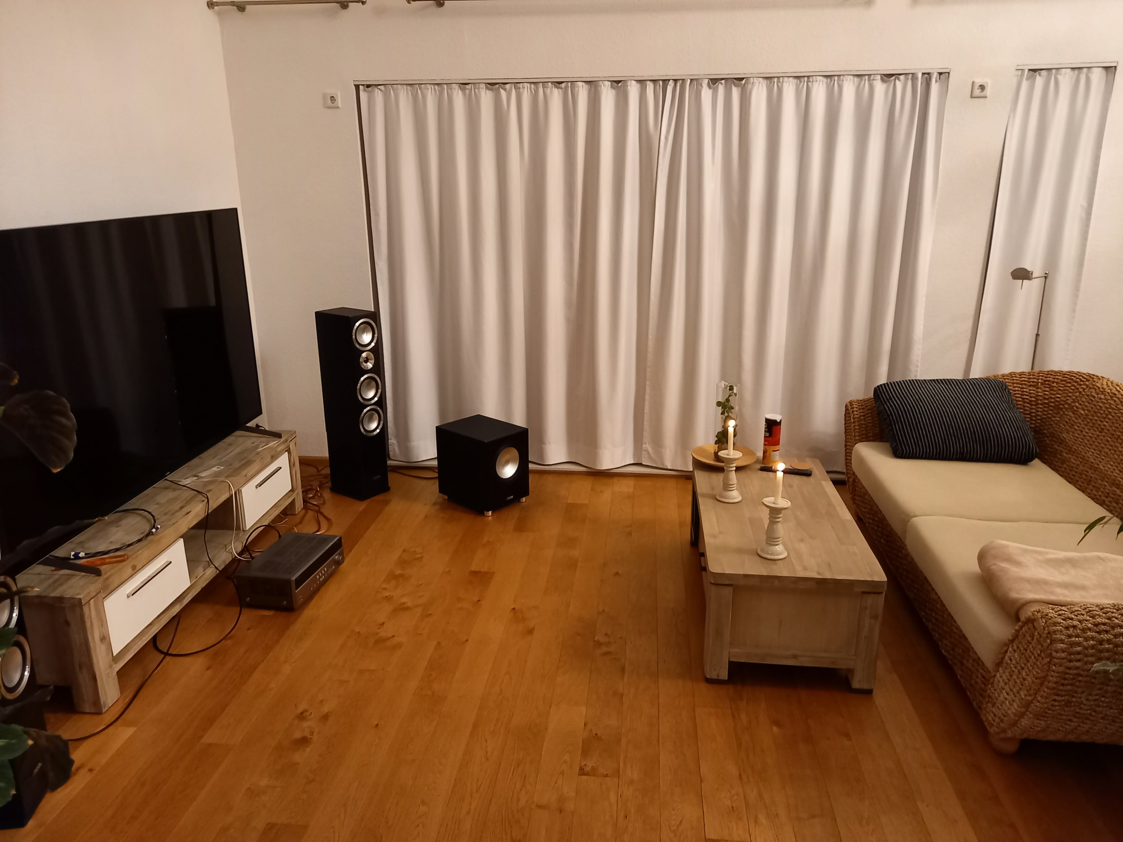 Die Entfernung zwischen Mitte TV und Mitte Sofa beträgt 3,55 Meter. Habe den Abstand bisher nicht variiert, erscheint mir bisher richtig.