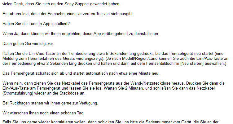 der Sony-Support antwortet wirklich sehr schnell, meine bisheringen zwei E-Mails wurden innerhalb von 24 Stunden beantwortet.