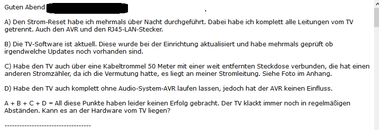 Nun bin ich wirklich gespannt. Konnte mein Umfeld so gut wie möglich ausschließen und tippe nun drauf dass etwas mit dem TV nicht stimmt. Habe jetzt schon keine Lust diesen wieder abbauen zu müssen